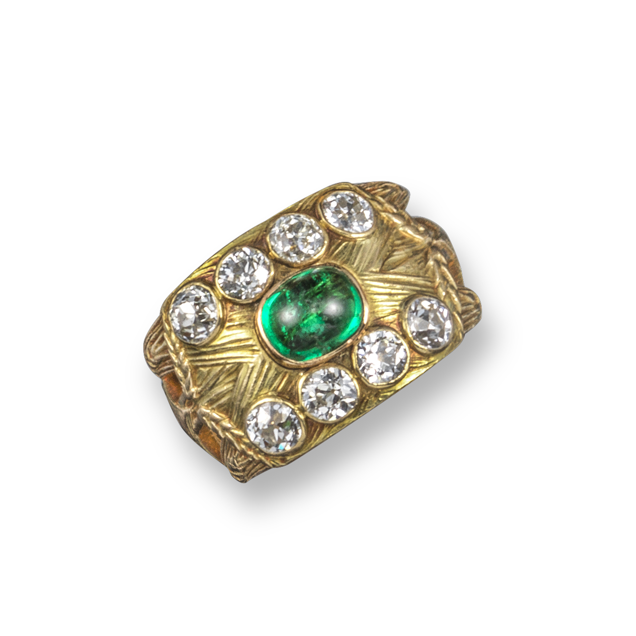 An Art Nouveau emerald and diamond ring by René Lalique, set with a sugarloaf emerald within borders of eight old cushion-shaped diamonds, within carved and pierced wheatsheaf-designed yellow gold shank, signed and with Polish marks for Warsaw, size P