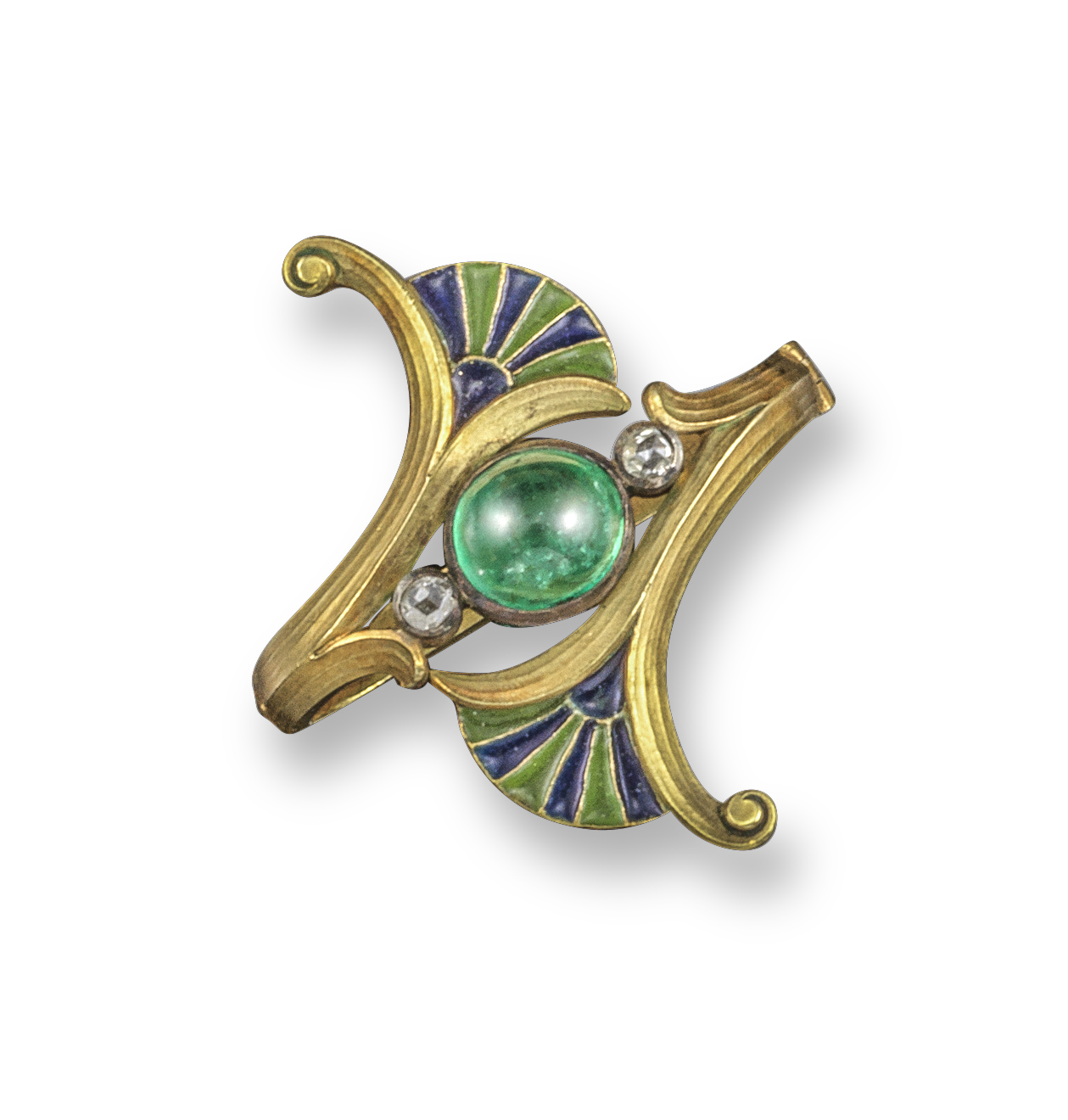 An Art Nouveau Egyptian Revival gold scarf ring, set with a cabochon emerald flanked with diamonds within plique-a-jour enamel stylised lotus flowers, set in textured yellow gold, 2.7cm wide