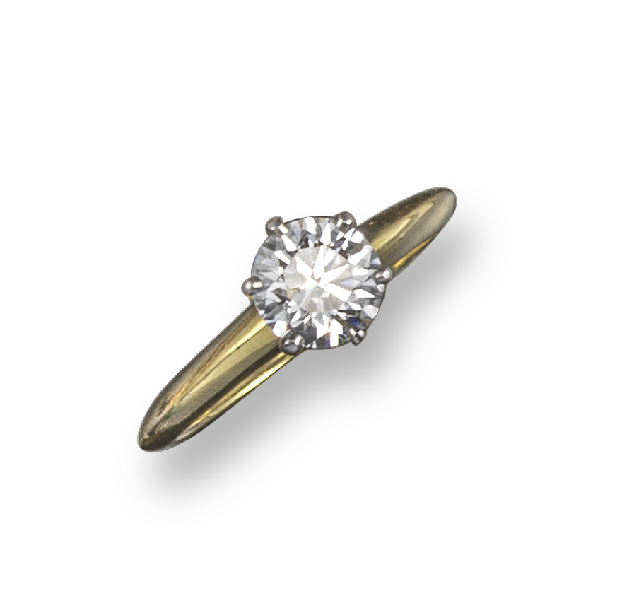 A diamond solitaire ring by Tiffany & Co., the round brilliant-cut diamond weighs 1.04cts and is Tiffany-set® in yellow gold on a plain knife-edge band, signed and with maker's mark, 18ct London hallmarks for 2000, size M 1/2, case by Tiffany & Co