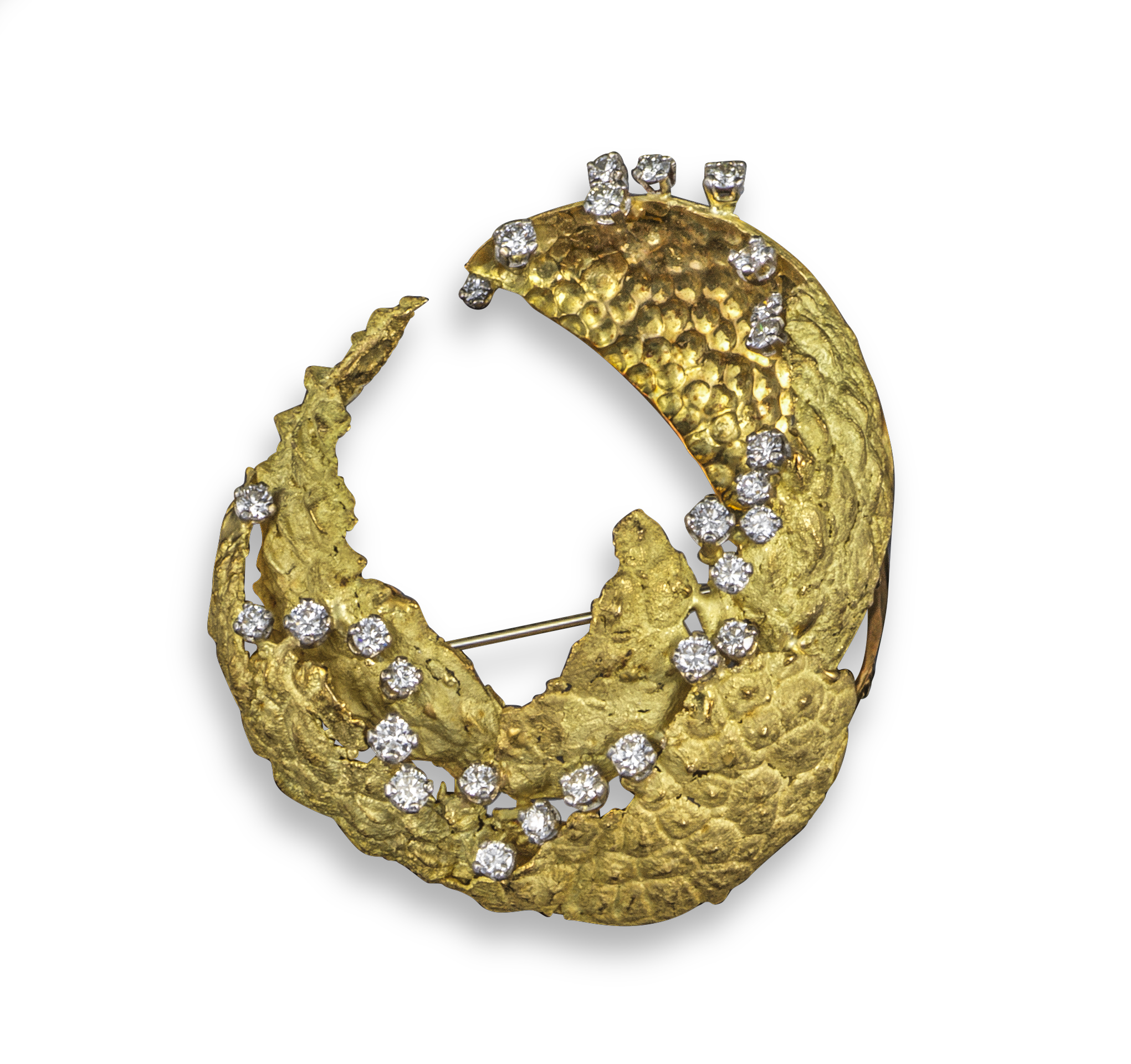 An abstract diamond brooch attributed to Andrew Grima, the textured 18ct yellow gold brooch decorated with graduated circular-cut diamonds in yellow gold, with London hallmarks for 1965 and maker's mark HJCo for Haller Jewellery Company Limited, 4.7cm wide