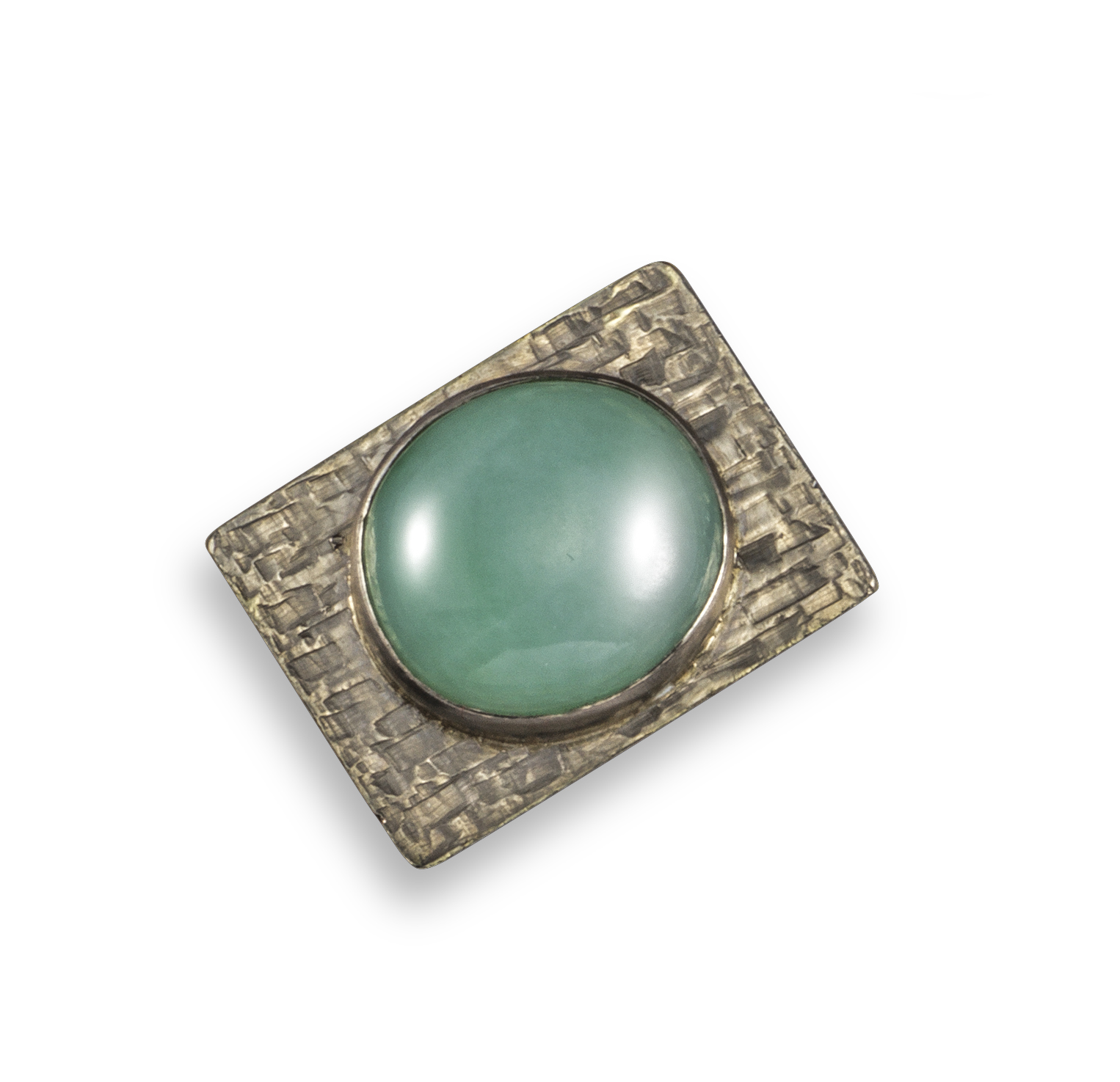 An 18ct white gold ring by Ingborg Bratman, with textured decoration to the shoulders and polished sides, pave-set with an oval-shaped light green jade cabochon, with London marks for 1975 and with maker's initials, size N