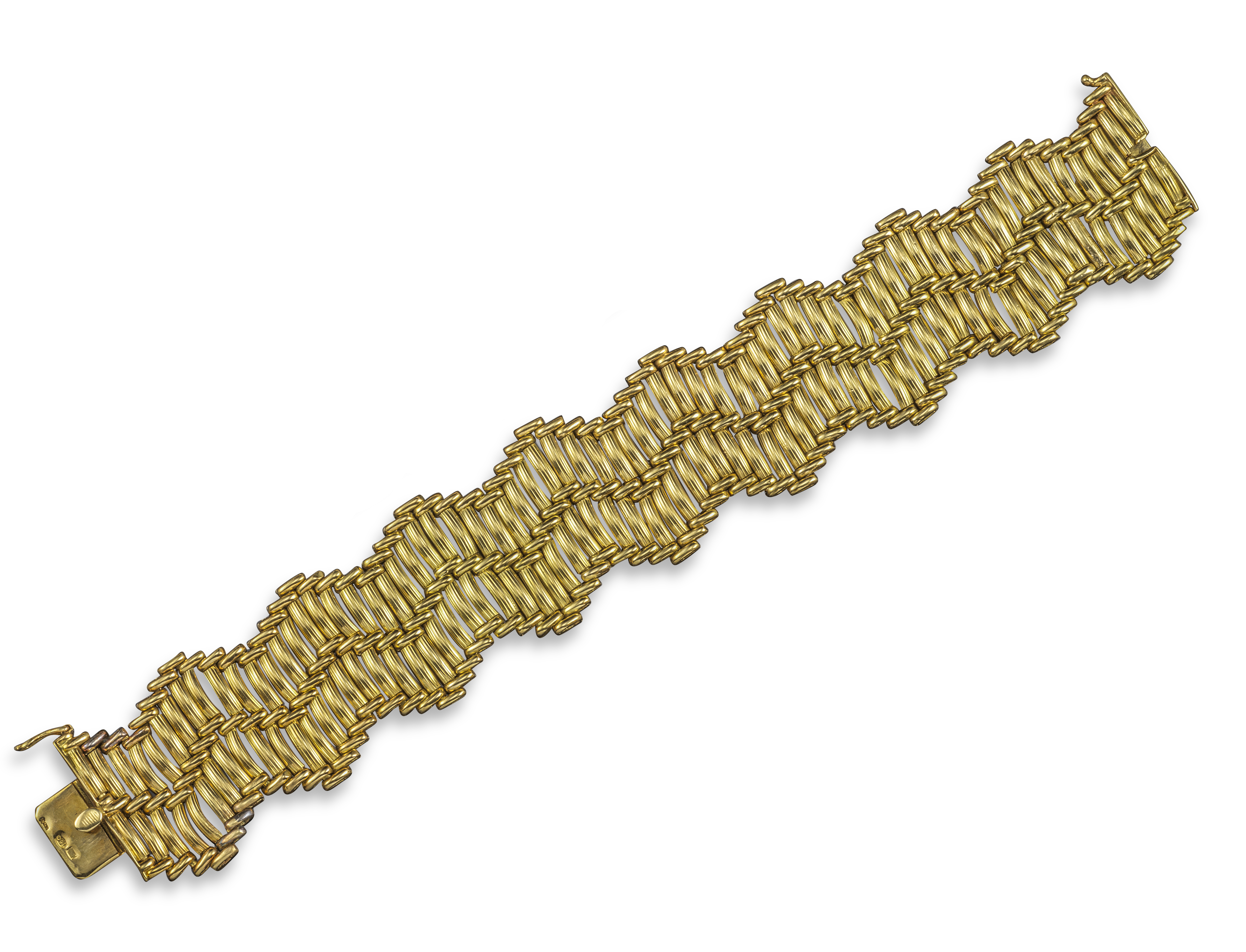 A gold fancy-link bracelet by Garrard & Co, 1960s, the textured fancy links in a zig zag design, with London import marks for 18ct 1960 and maker's mark G E Co, 19.5cm long, 83.8g