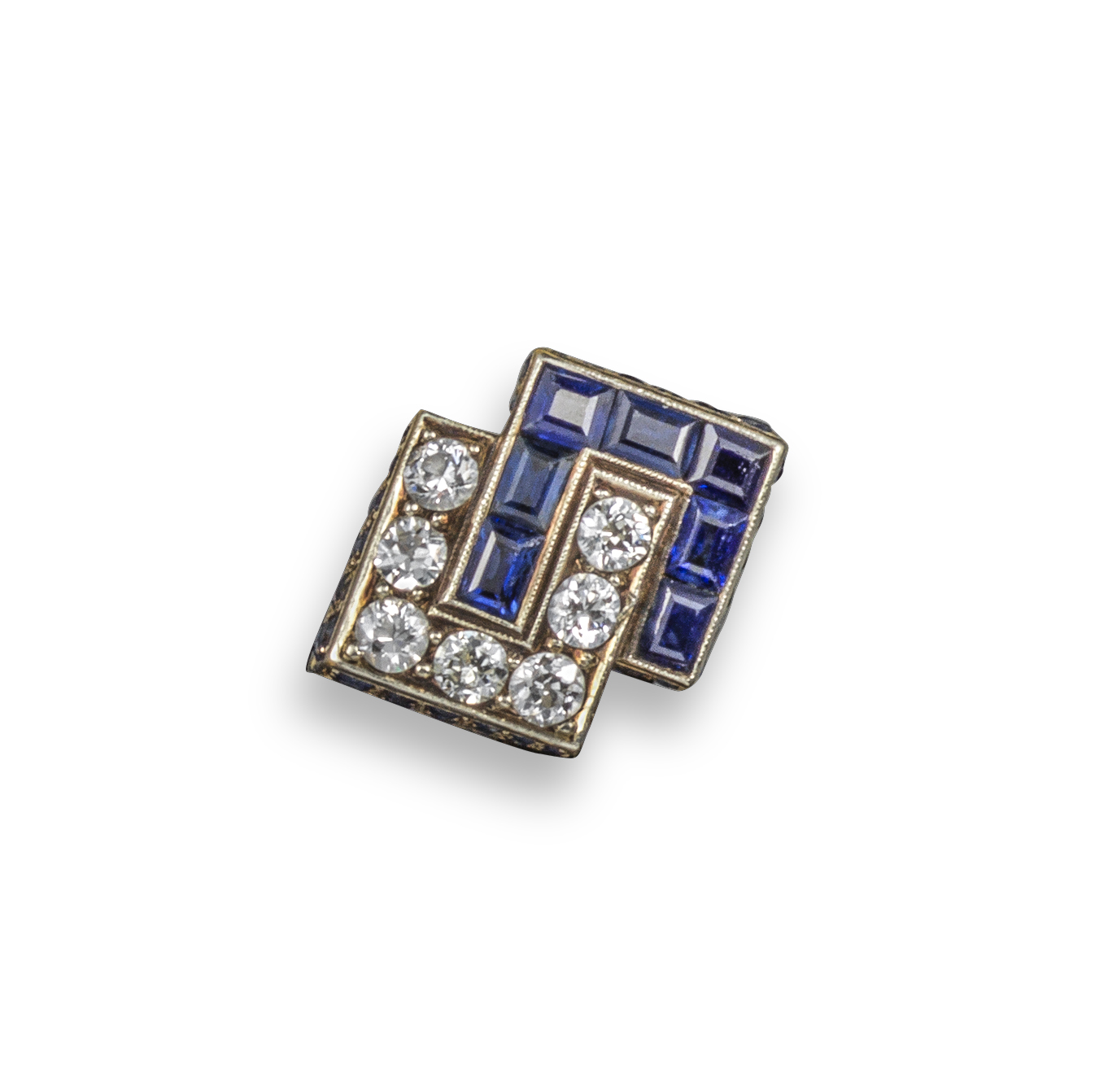 An abstract sapphire and diamond ring, set with two interlocking sections of calibre-cut sapphires and circular-cut diamonds with a sapphire-set gallery (three missing) in white gold, size N 1/2