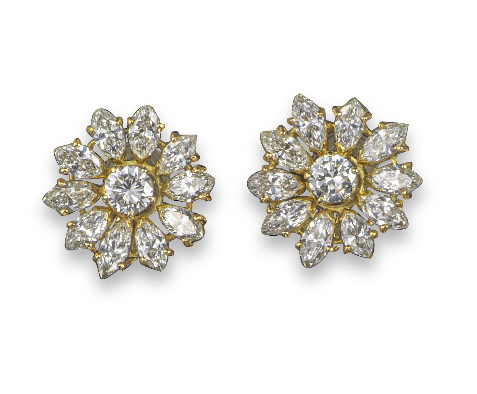 A pair of diamond cluster earrings, of flowerhead design, each centred with a round brilliant-cut diamond within a surround of marquise-shaped diamonds in yellow gold, centre diamonds approx. 1.30cts total, post and clip fittings, 2.2cm high