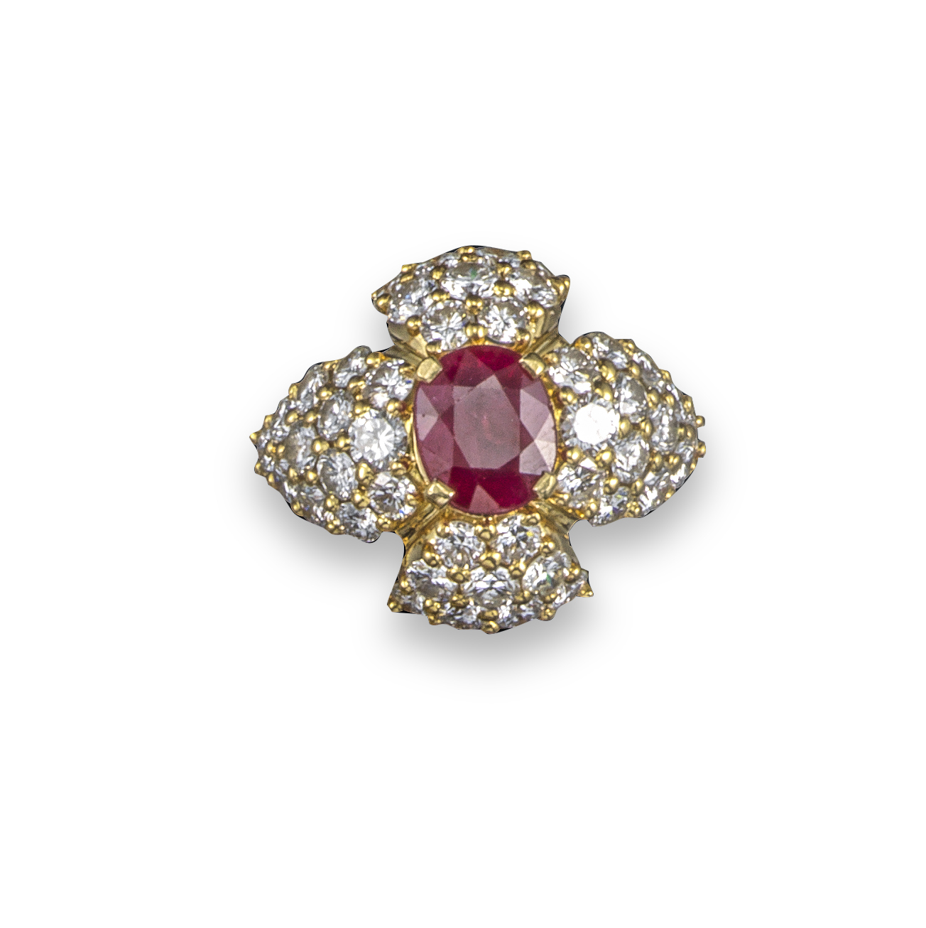 A ruby and diamond cluster ring, of flowerhead design, centred with an oval-shaped ruby, the petals pavé-set with round brilliant-cut diamonds in yellow gold, size N