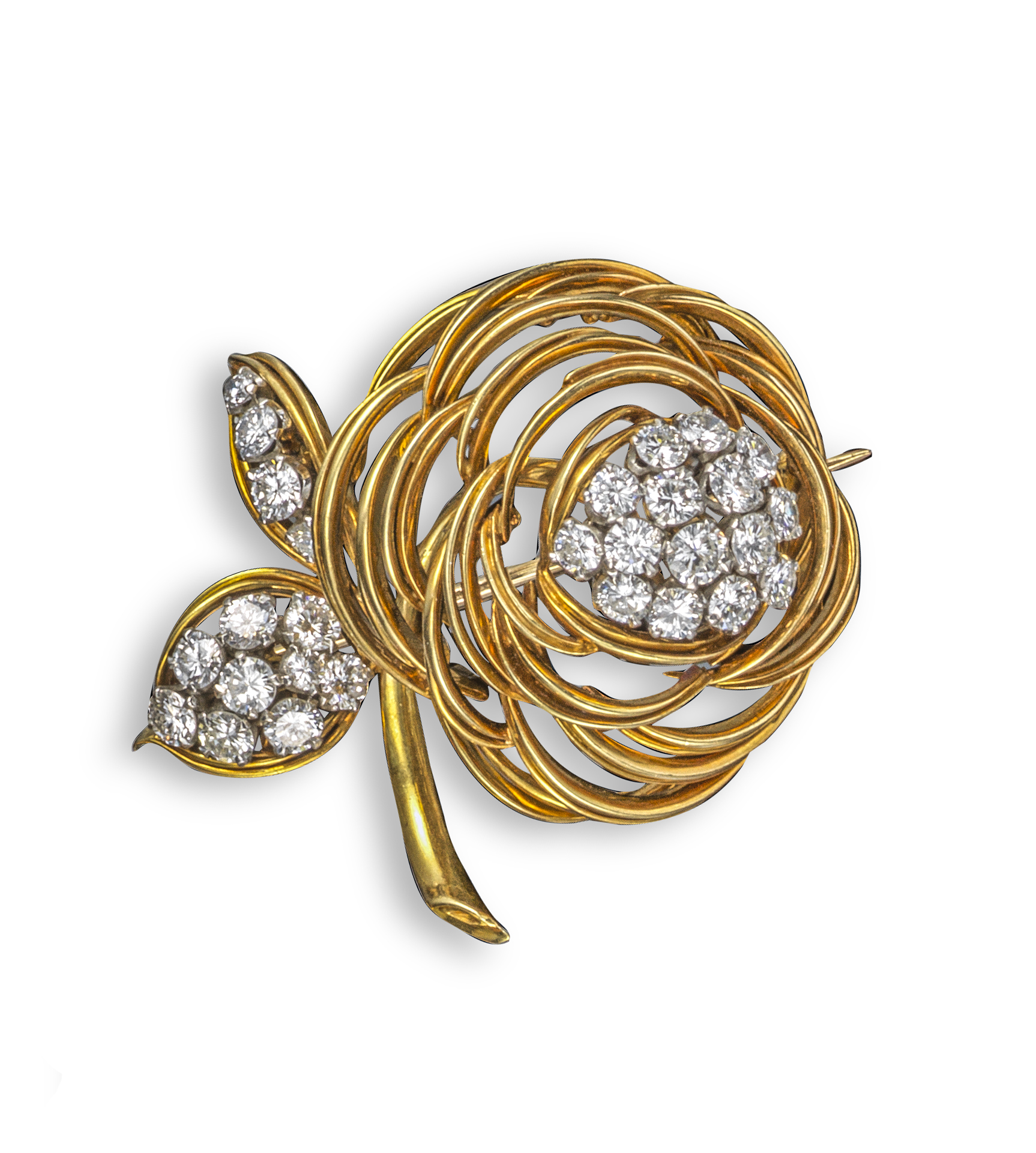A diamond-set flowerhead brooch by Asprey, the stylised flower set with clusters of graduated circular-cut diamonds in 18ct yellow gold, London hallmarks for 1961, signed, 4.8cm high