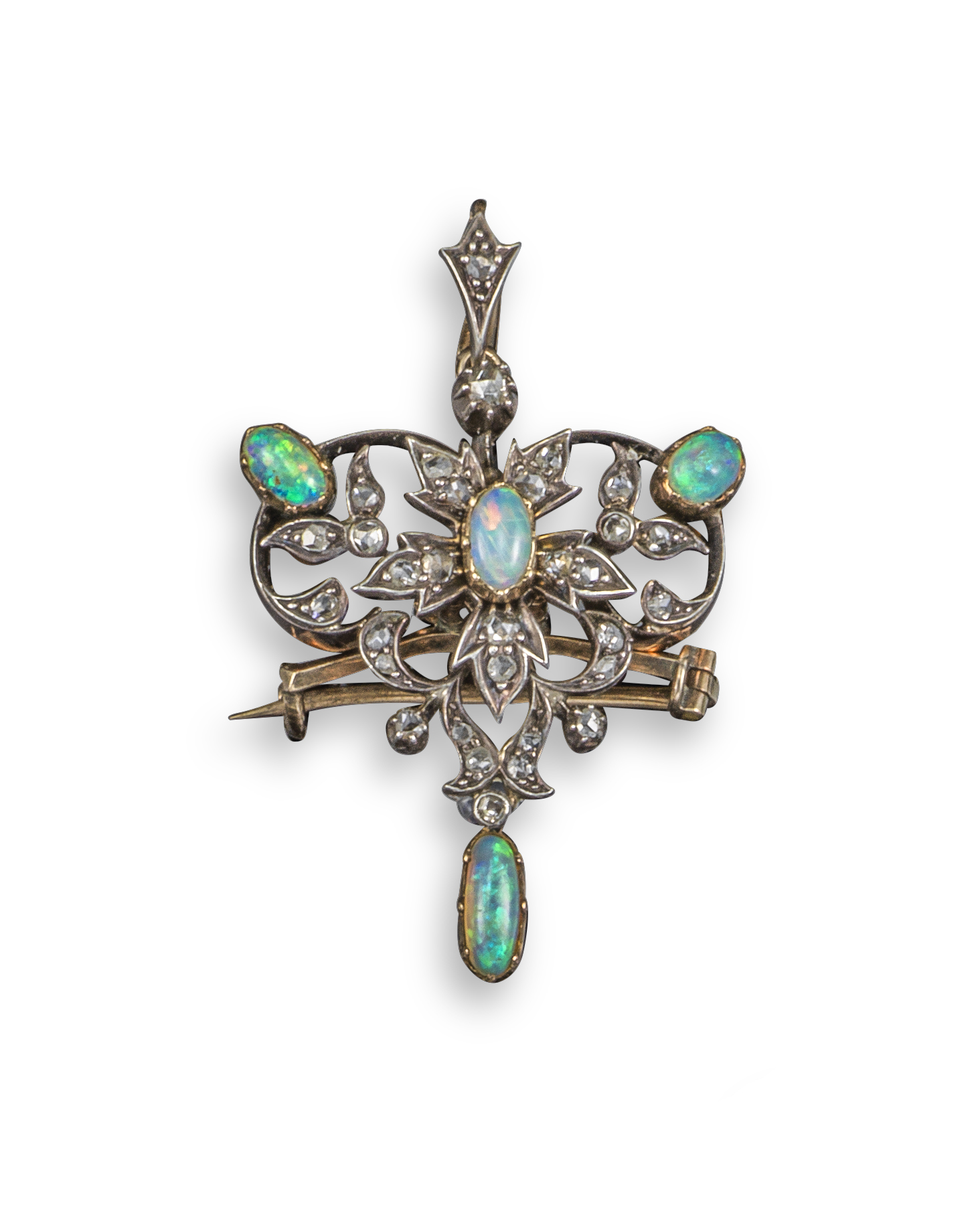 A Victorian opal and diamond pendant, set with oval opal cabochons within diamond-set foliate surround in silver and gold, detachable pendant loop and brooch fitting, 4.5cm long