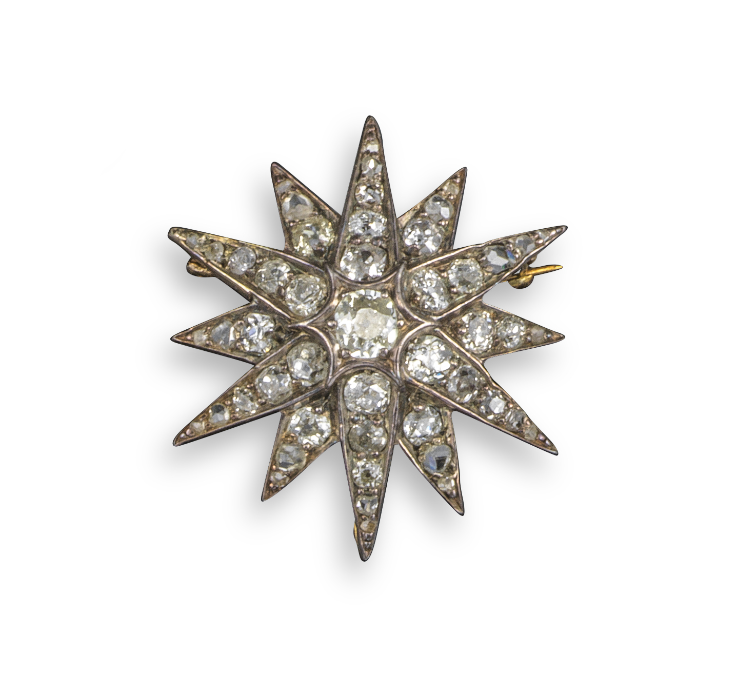 A late Victorian diamond star brooch, set overall with graduated old cushion-shaped diamonds in silver and gold, pendant fitting to reverse, 3cm wide
