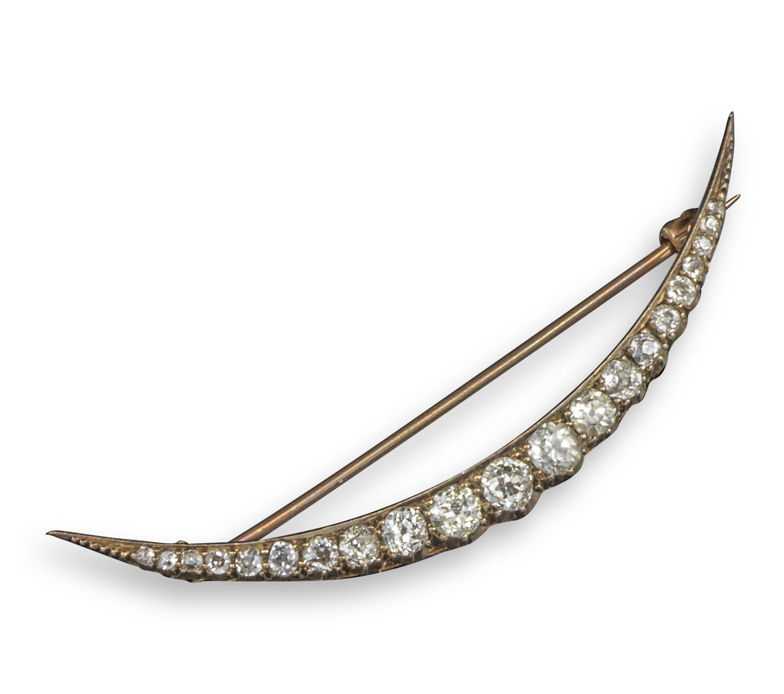 A Victorian diamond open crescent brooch, set with graduated old circular-cut diamonds in silver and gold, 6cm wide
