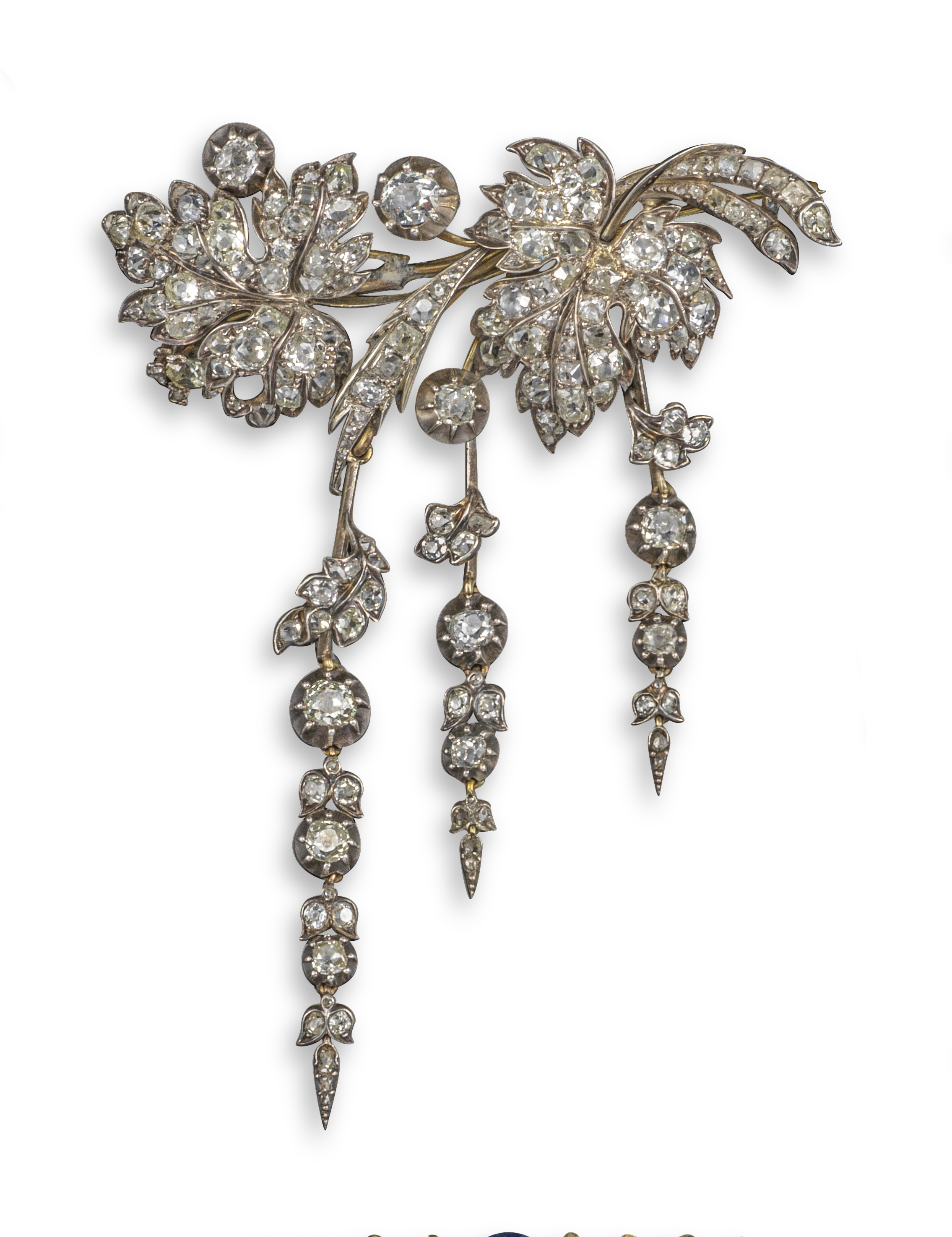 A late 19th century diamond foliate brooch, set overall with graduated old cushion-shaped diamonds (one missing) in silver and gold, suspending three detachable articulated diamond-set swags, 6.5cm wide, case