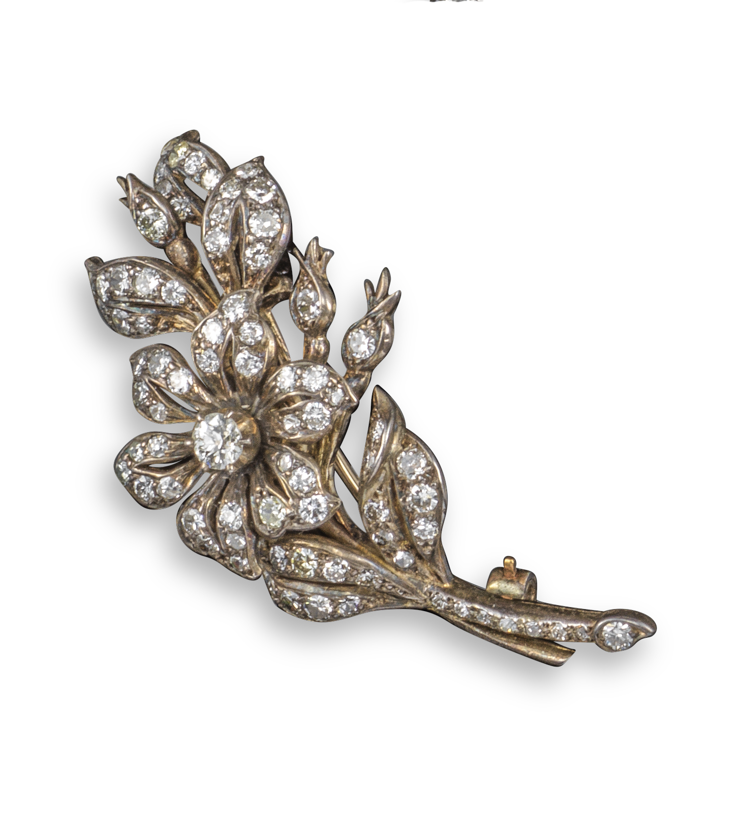 A Victorian diamond foliate brooch, set overall with graduated old cushion-shaped diamonds in silver and gold, the flowerhead mounted en tremblant, 5cm long