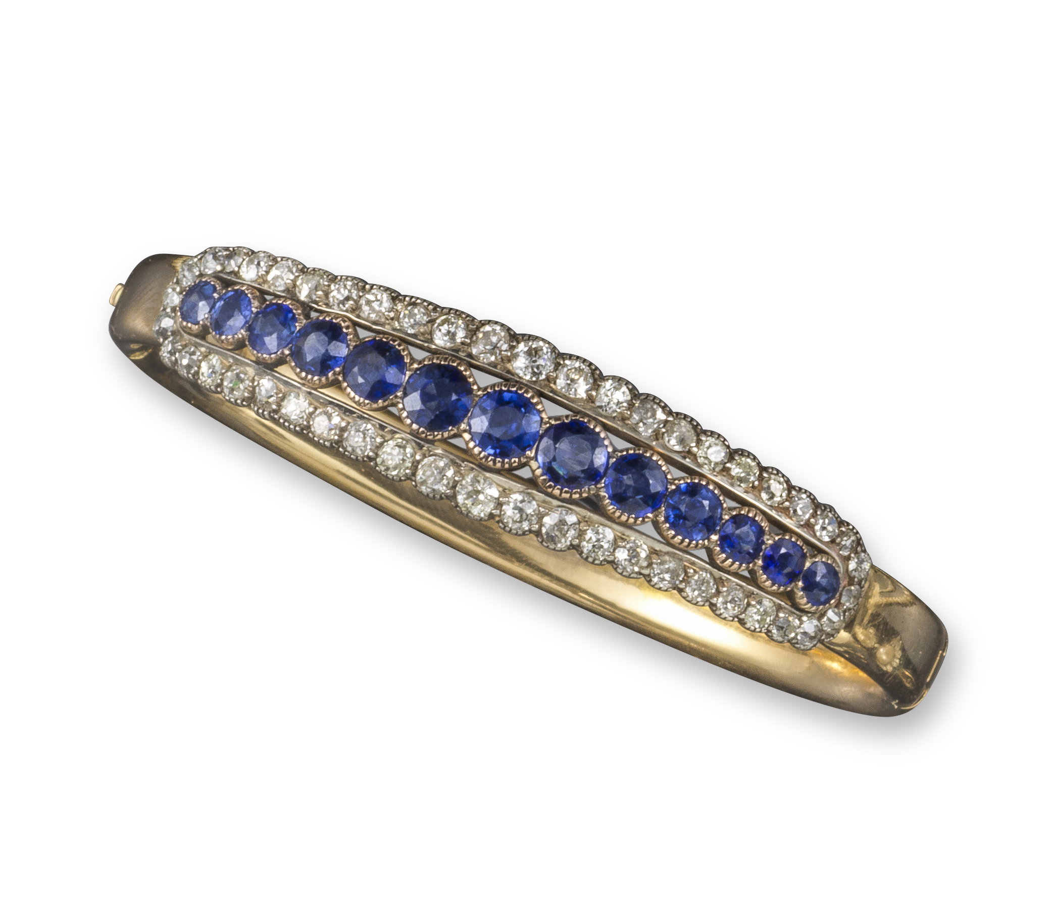 A late Victorian sapphire and diamond bangle, set with a line of graduated circular-cut sapphires within scalloped border of old circular-cut diamonds in silver and gold, 5.6cm internal diameter, case