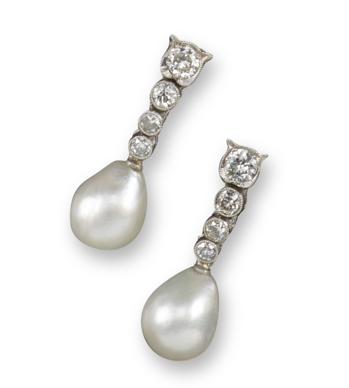 A pair of natural pearl and diamond drop earrings, the natural pearls suspend from an articulated line of graduated old circular-cut diamonds in platinum, post fittings, 3.7cm high