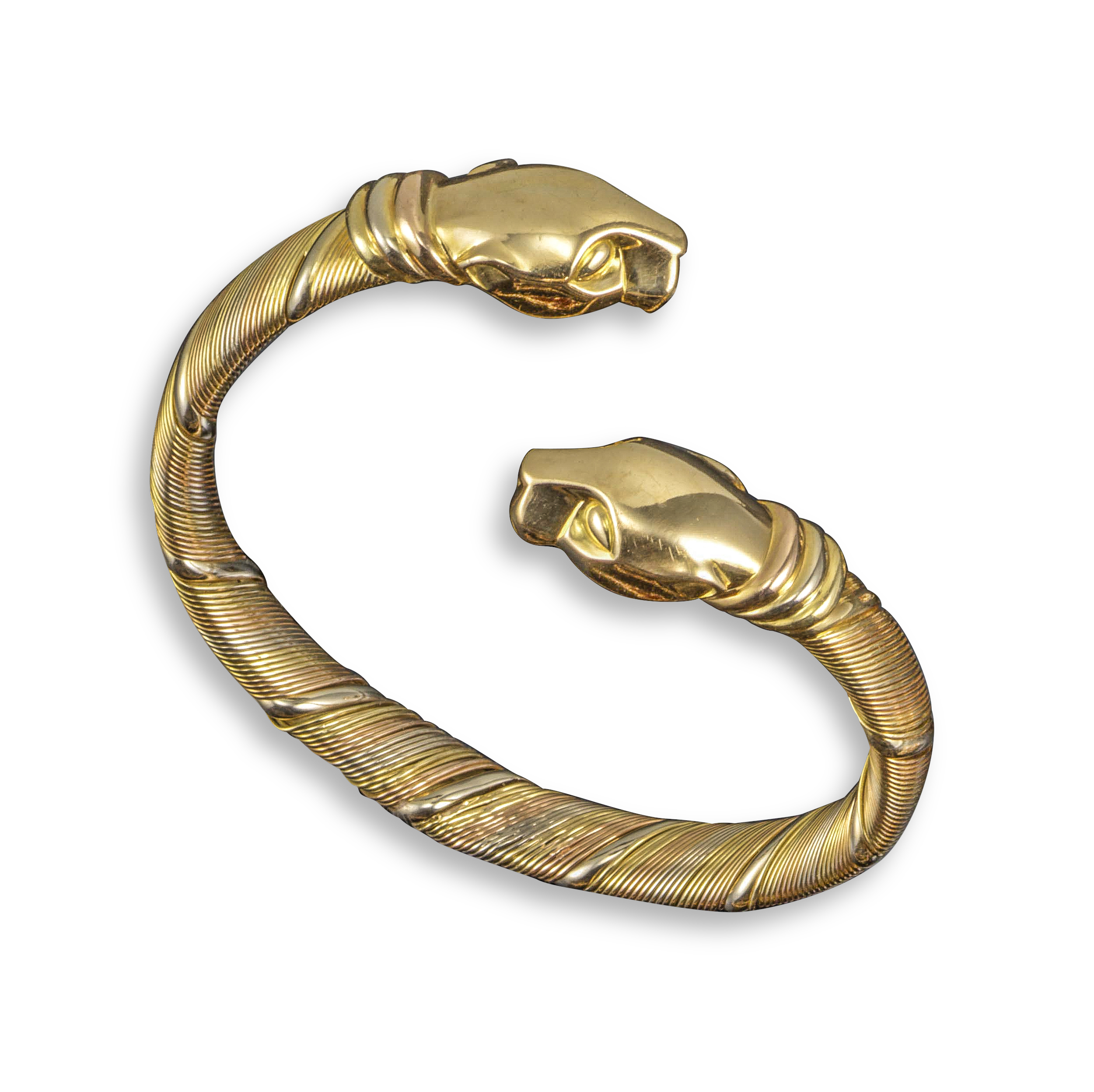 A 'Panthere' tri-colour gold bangle by Cartier, of torc design, the flexible hoop with tri-colour gold wirework decoration, with polished panther head terminals, signed Cartier, inventory number 762897, internal diameter 6.5cm, 50.1g