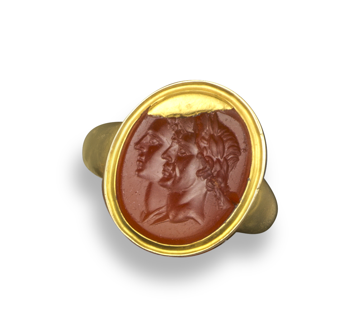A Julio-Claudian dynasty carnelian intaglio depicting an emperor and his wife, c.1st - 2nd century AD, in later gold ring mount, intaglio 1.7cm high, approximately ring size S