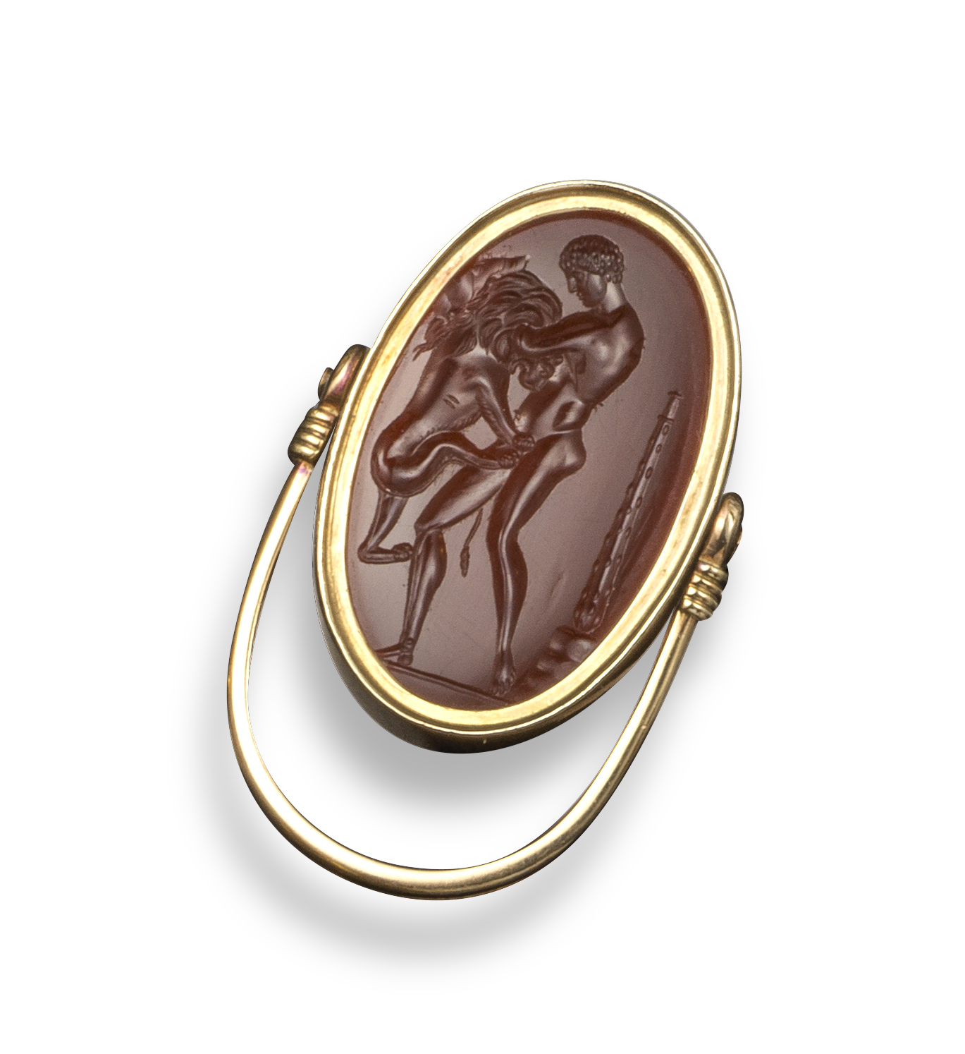 An 18th century two-sided carnelian intaglio, depicting Hercules slaying the Nemean lion with his club standing vertical behind to one side, the other with gnostic carved inscription, one set within a coiled snake border, mounted in an 18th century gold collector's mount, intaglio 2.7cm high, ring size S