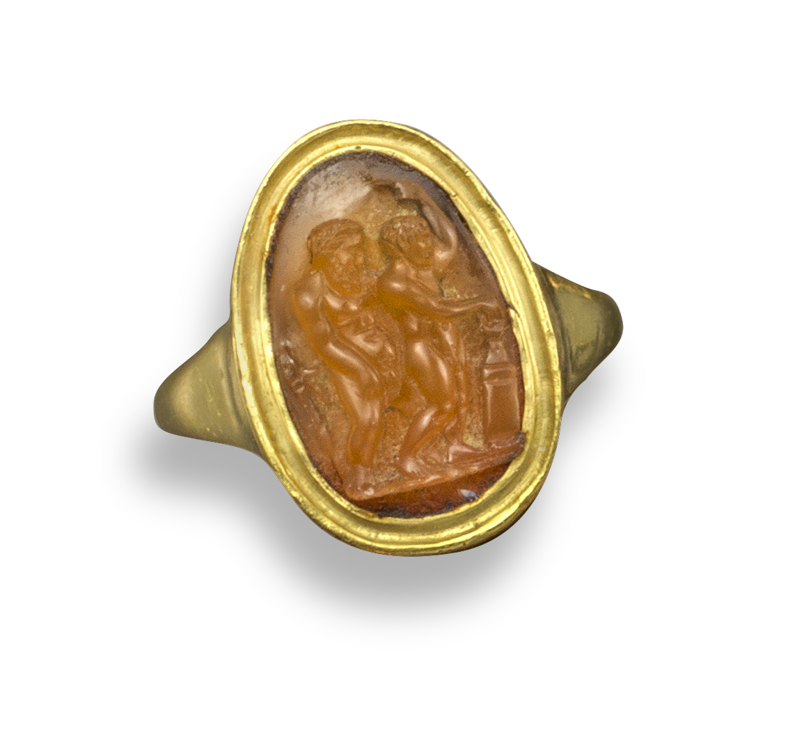 A Renaissance cornelian cameo depicting a Bacchanalian scene of a satyr and fawn, c.1580, in a later gold ring mount, cameo 1.9cm high, ring size T