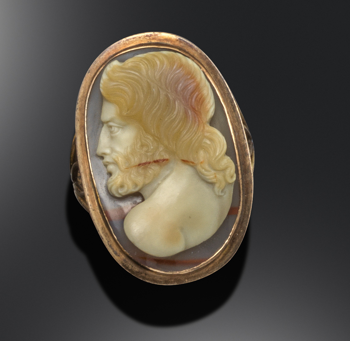 A late 18th century agate cameo depicting Jupiter, in gold ring mount, cameo 2.6cm high, approximately ring size O