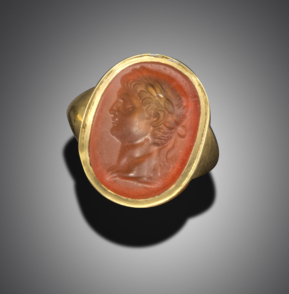 A carnelian intaglio depicting a young Claudius Caesar laureate, possibly provincial Ancient Roman, in later gold ring mount, intaglio 1.7cm high, ring size K 1/2