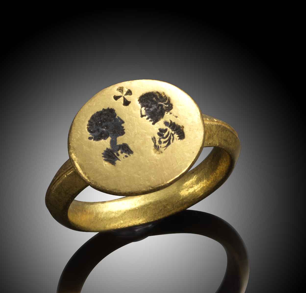 A late Roman gold marriage ring, c. 4th-5th century AD, depicting a couple beneath Byzantine cross, probably in niello, ring size P approximately