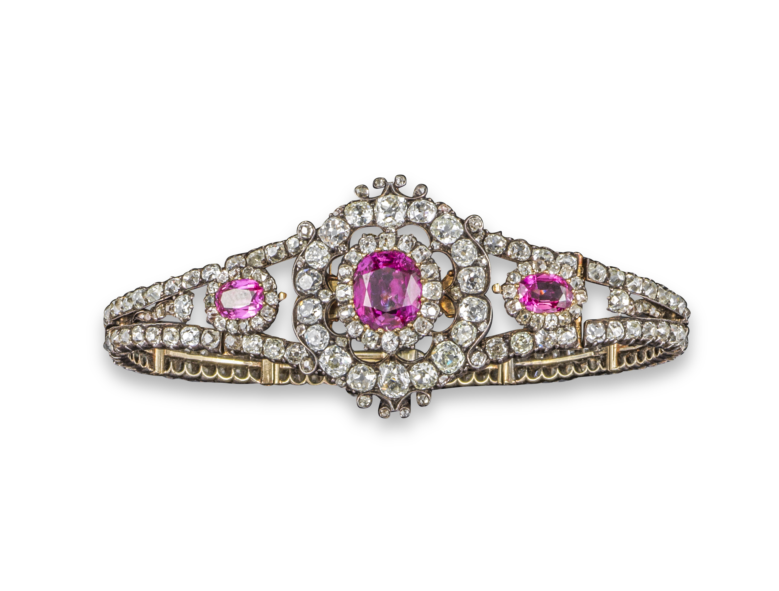 A late 19th century sapphire and diamond bracelet, set with a cushion-shaped pink sapphire within surrounds of cushion-shaped diamonds in silver and gold, with a sapphire and diamond cluster to each shoulder on a diamond bracelet, the centre section detaches entirely to be worn separately either horizontally or vertically, 17.5cm long