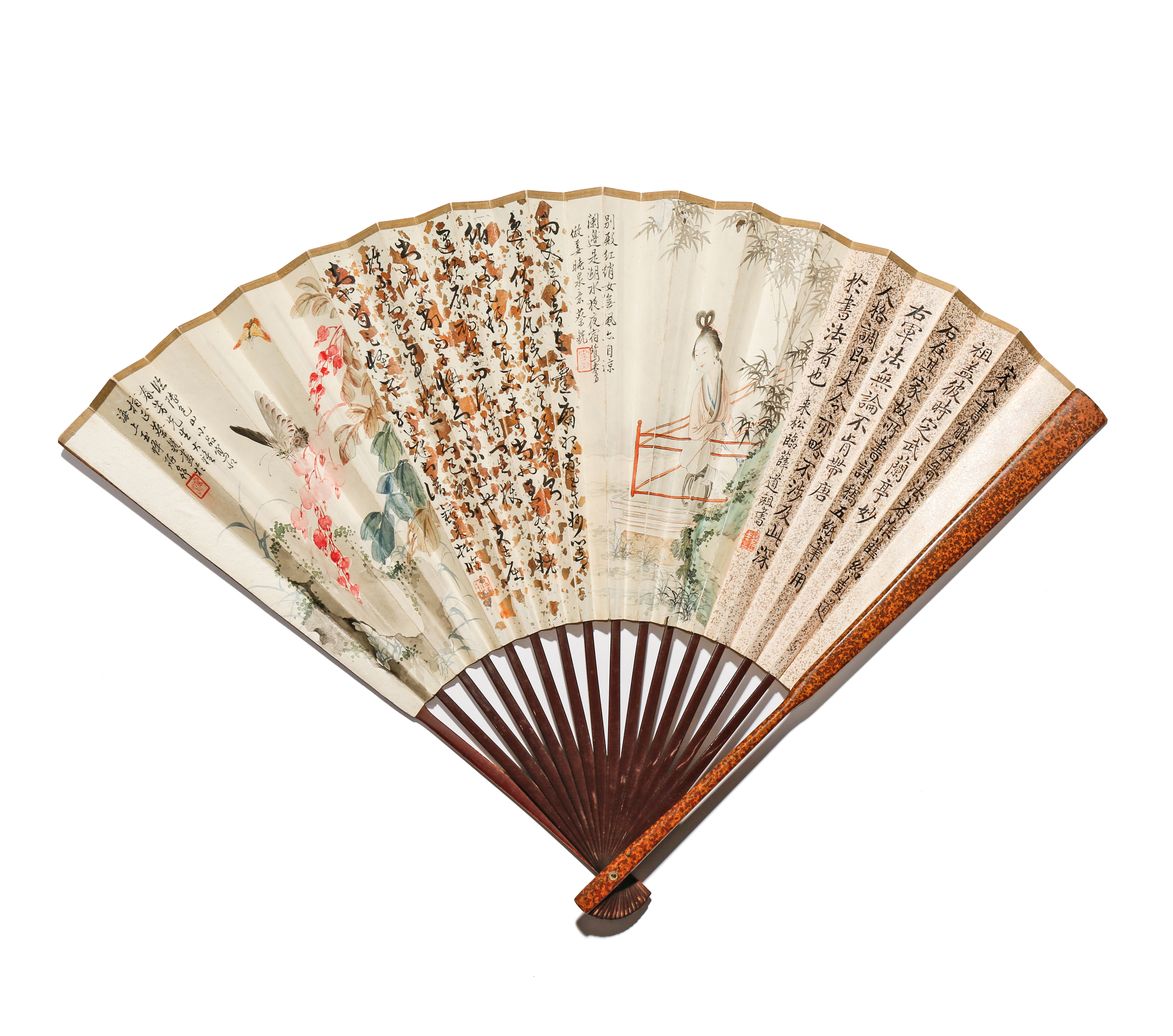 A Chinese xipi lacquer fan, ink and colour on paper, each side with extensive inscriptions signed by Zhong Laisong with his four seals, dated wu yin year, painted and signed by Cai Xian with five artist's seals, 47.5cm across.