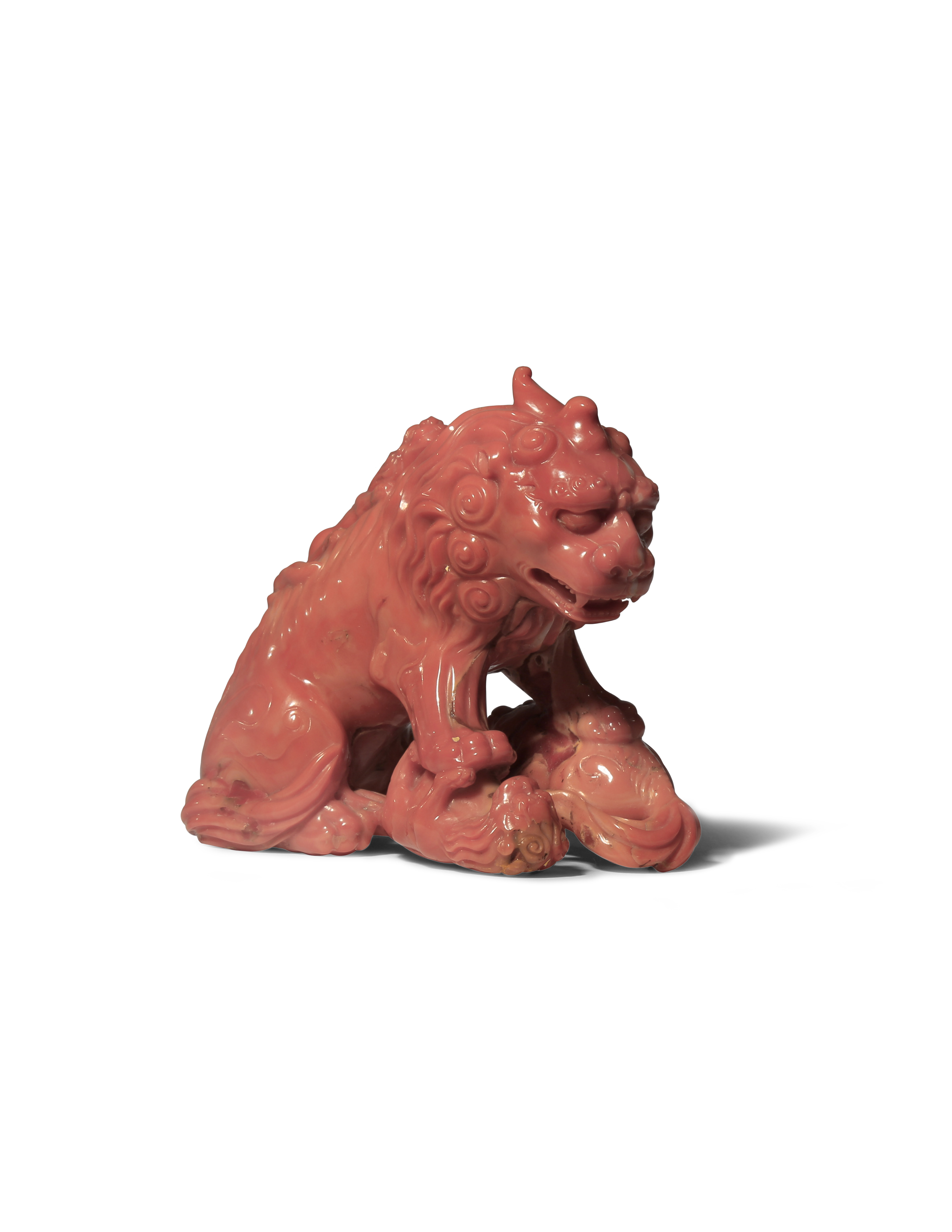 A CHINESE CORAL 'LION DOGS' GROUP LATE QING DYNASTY The large mythical beast depicted seated on...