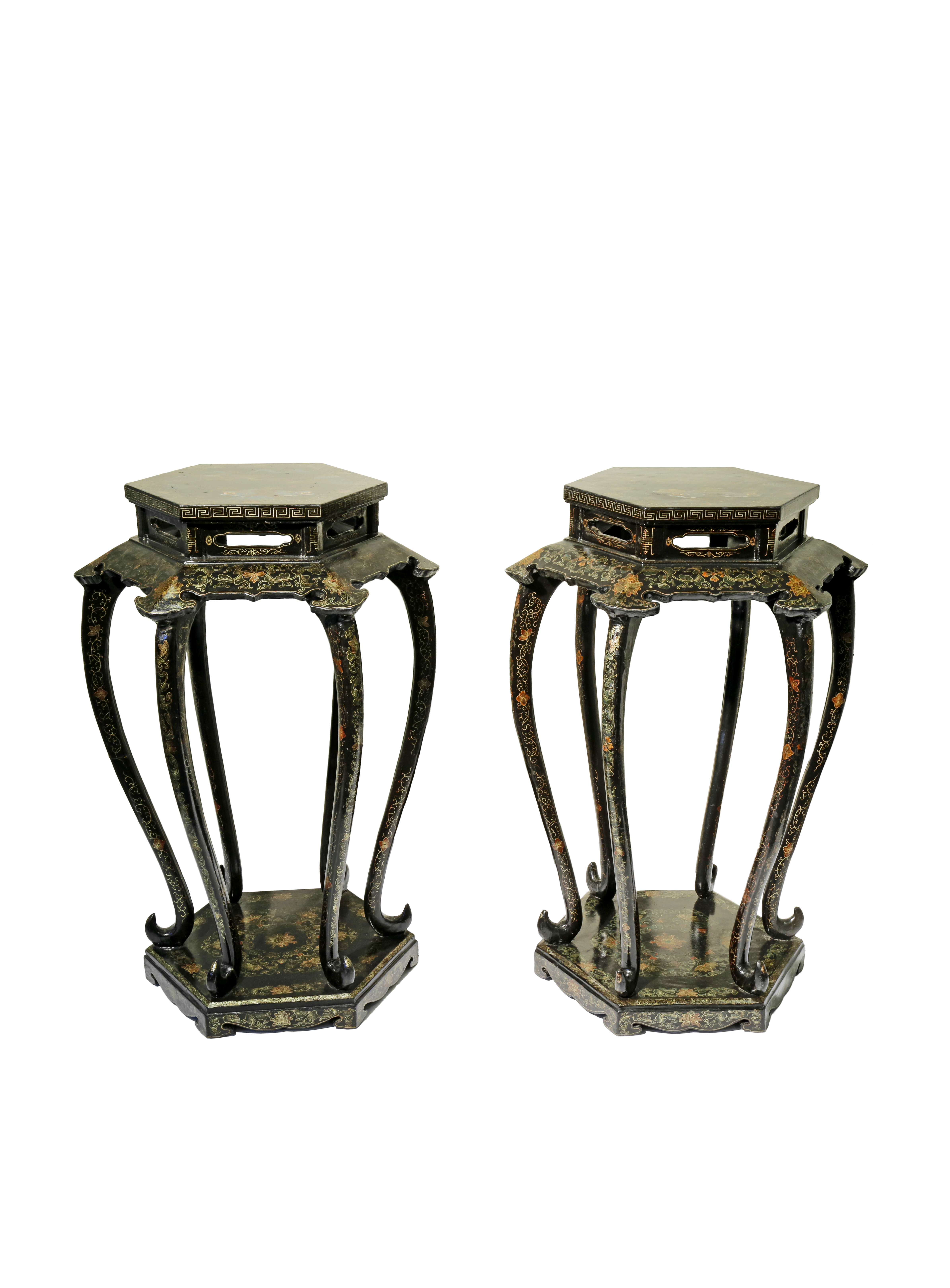 A PAIR OF LARGE CHINESE HEXAGONAL LACQUERED WOOD STANDS
