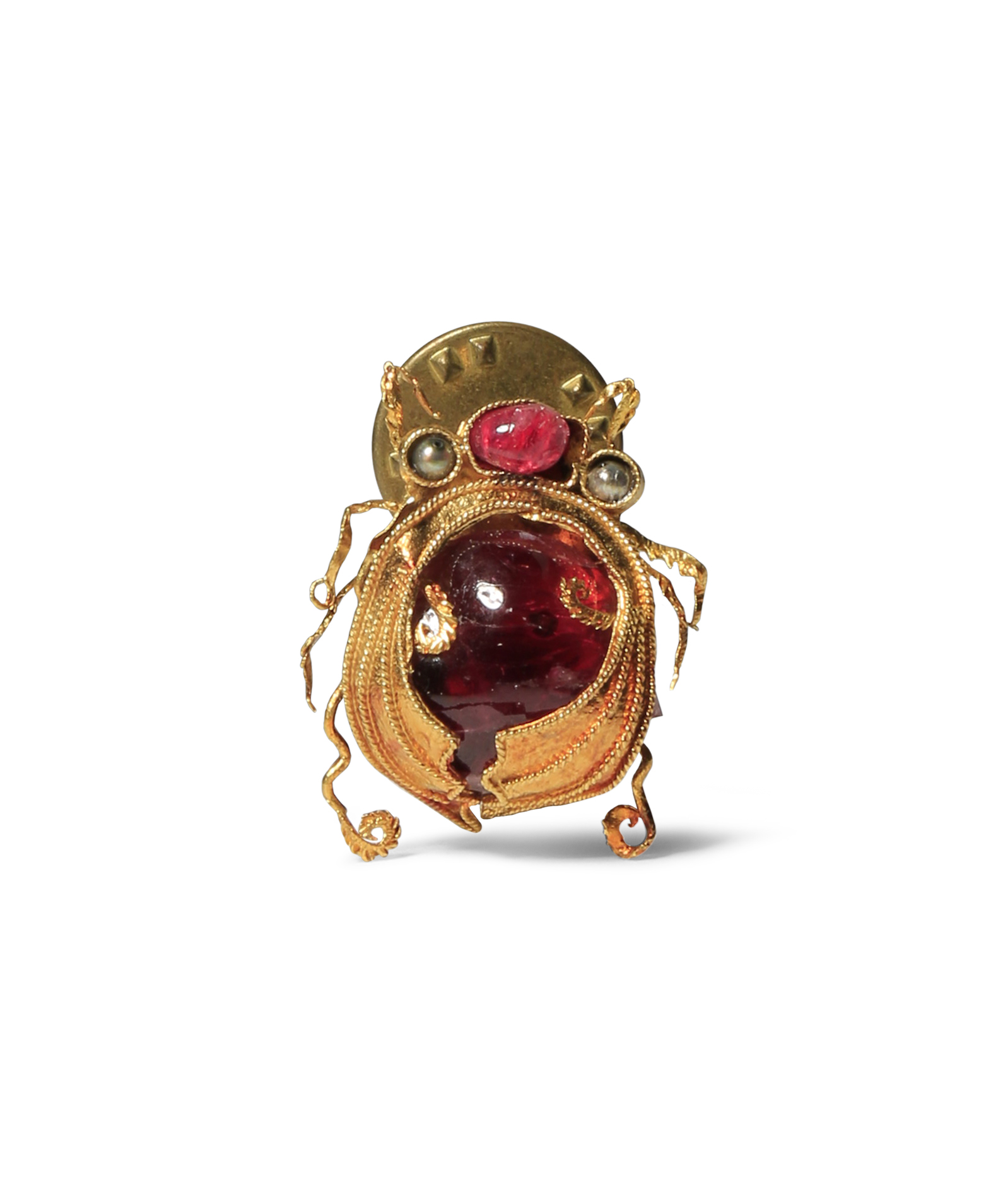 The body set with a large red stone, the details in gold filigree, later mounted as a brooch, 2cm.