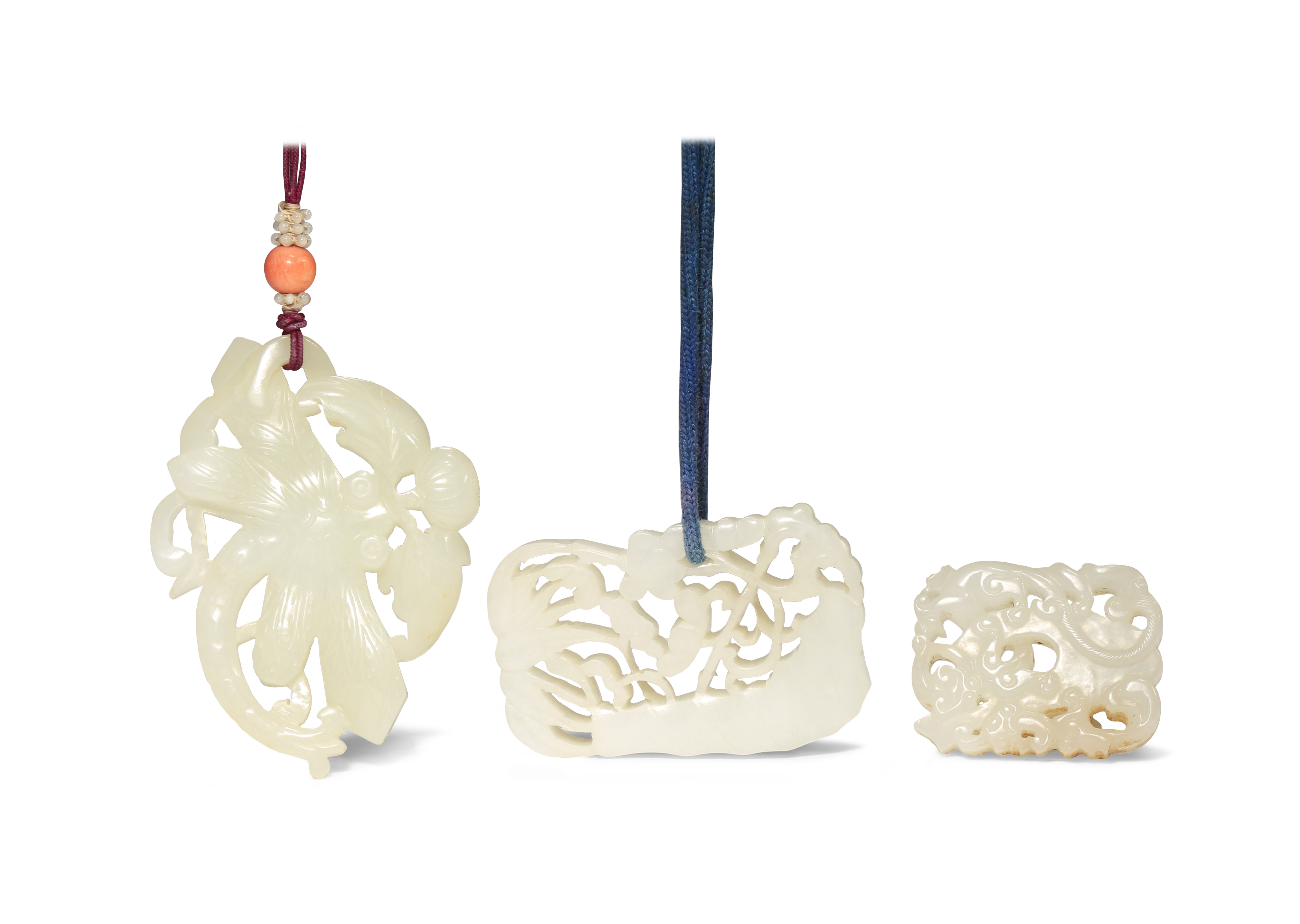 THREE CHINESE WHITE AND PALE CELADON JADE OPENWORK PENDANTS QING DYNASTY The smallest worked in...