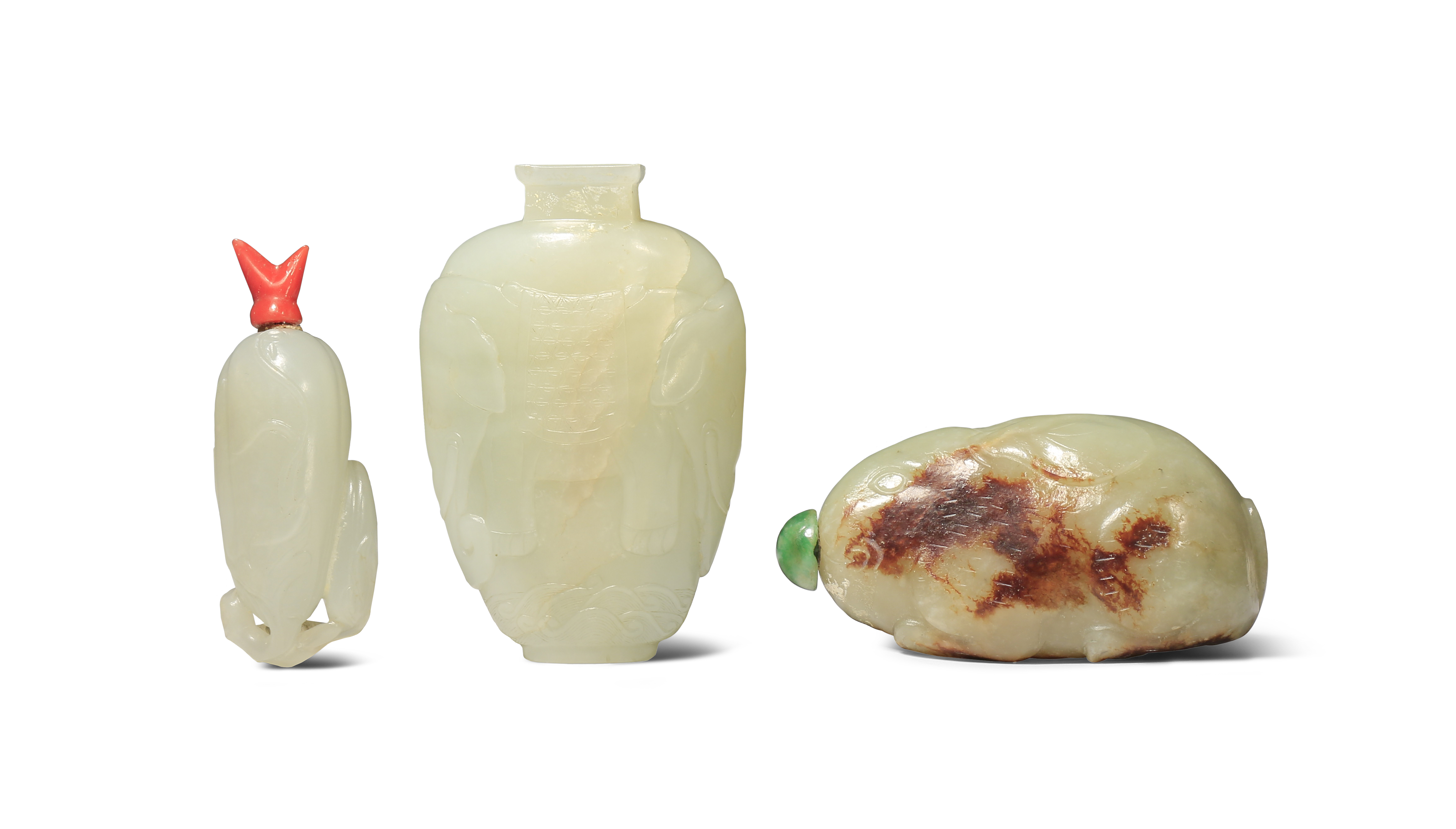 One of flattened oval form, carved in shallow relief with elephants above rolling waves, the stone pale celadon and with minor white inclusions, another bottle celadon and russet jade and formed as a crouching rabbit, the smallest shaped as two melons with vines around the fruit, the stone a pale celadon colour with minor white mottling, 7.8cm max. (3)