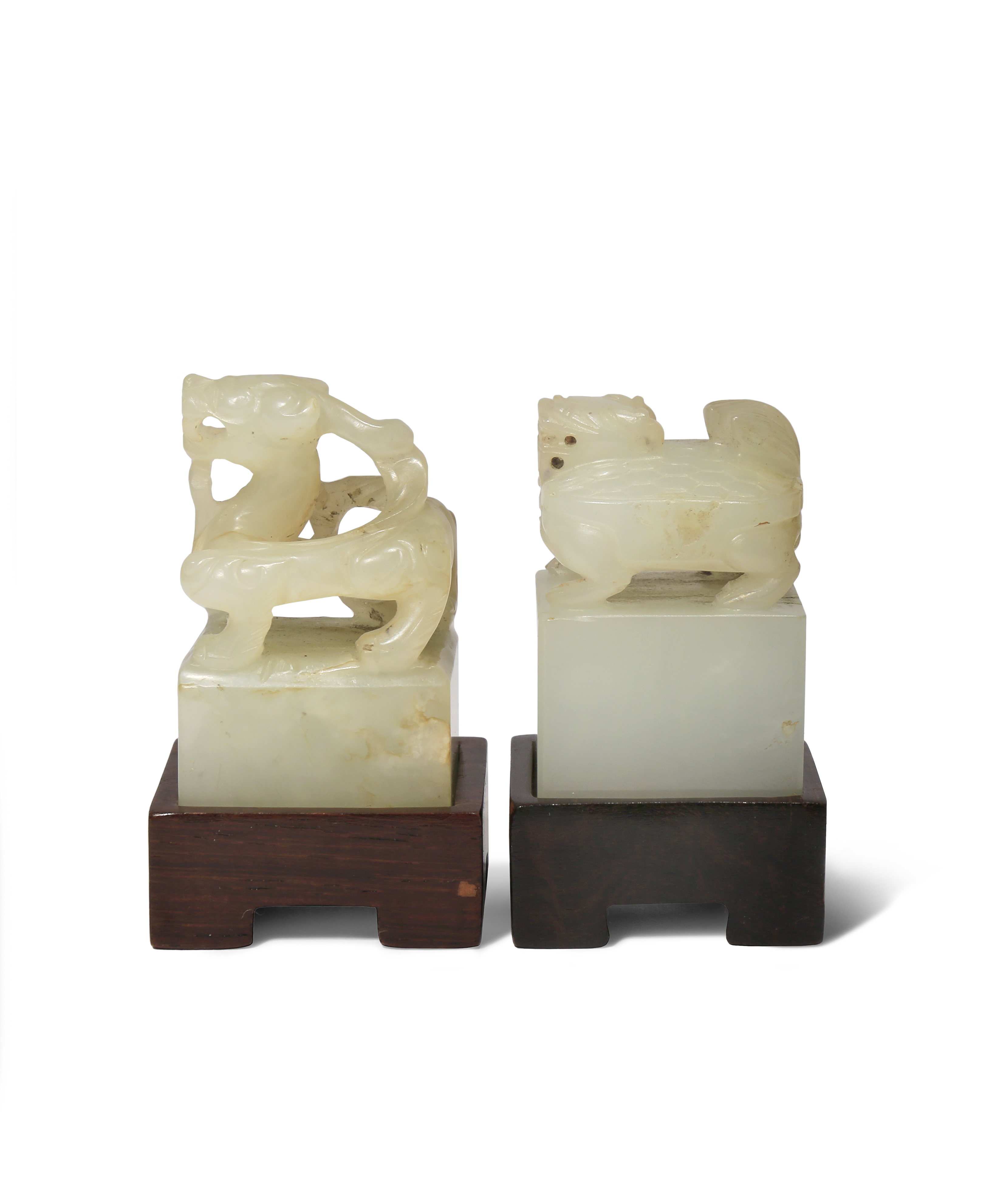 Each carved with a mythical beast stood upon a simple square-section base, one with a four character mark to the base which reads liu zai chun qiu, the other uncut, together with wood stands, 4.1cm and 4.3cm. (4)