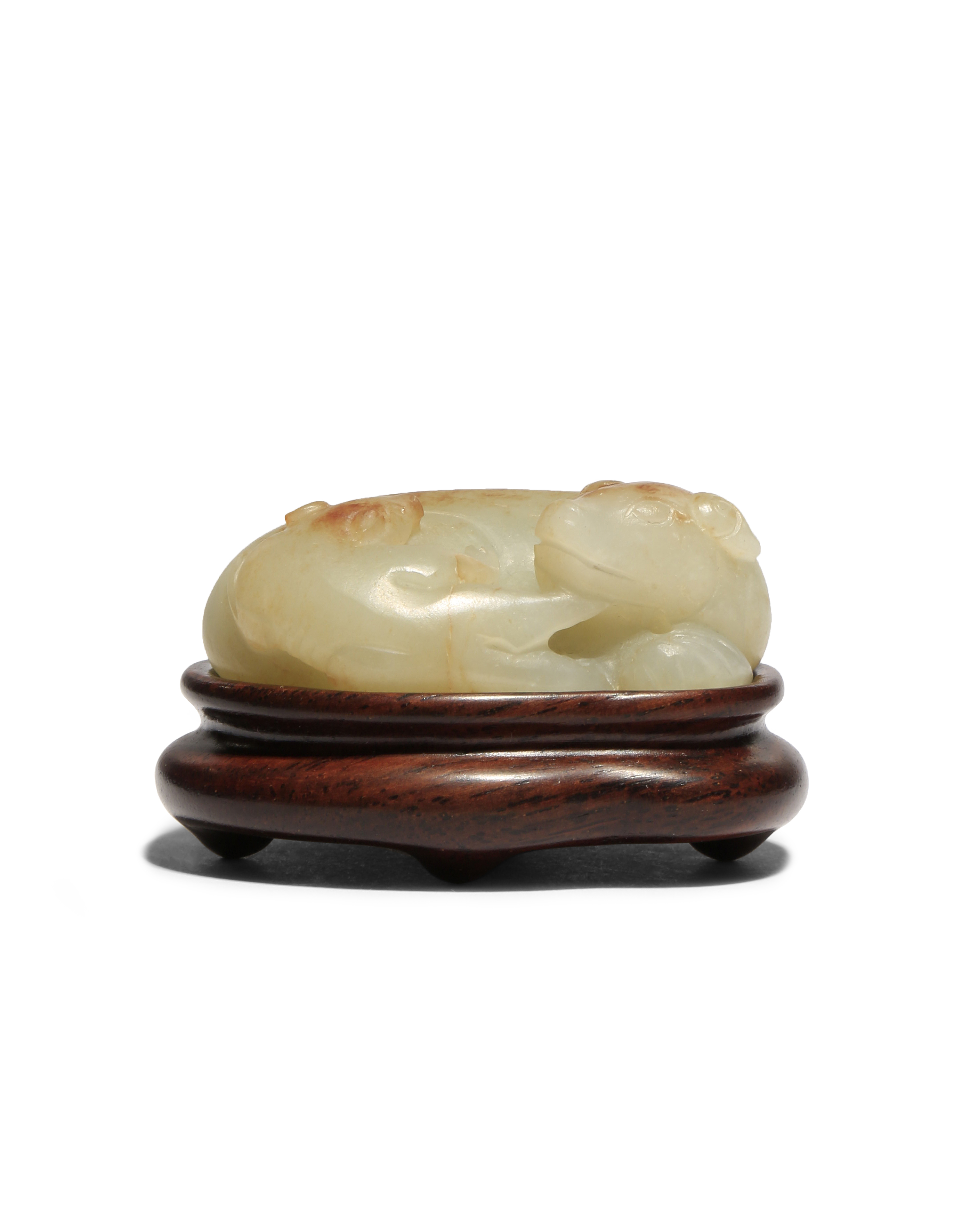 A CHINESE CELADON JADE 'BADGER' GROUP LATE MING DYNASTY Formed as a badger lying down with her...