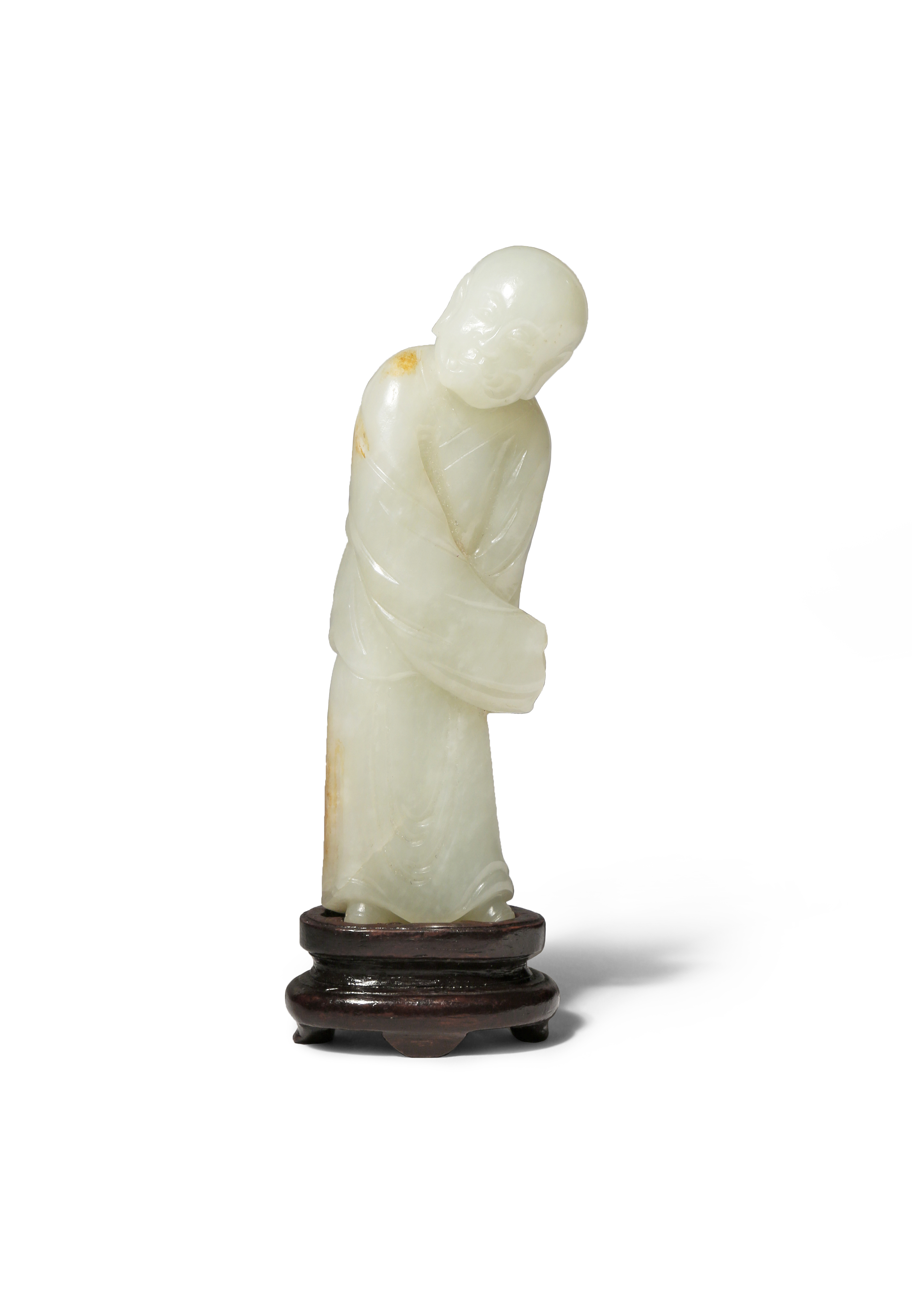 A CHINESE PALE CELADON JADE CARVING OF A LUOHAN QIANLONG 1736-95 The figure stands leaning...
