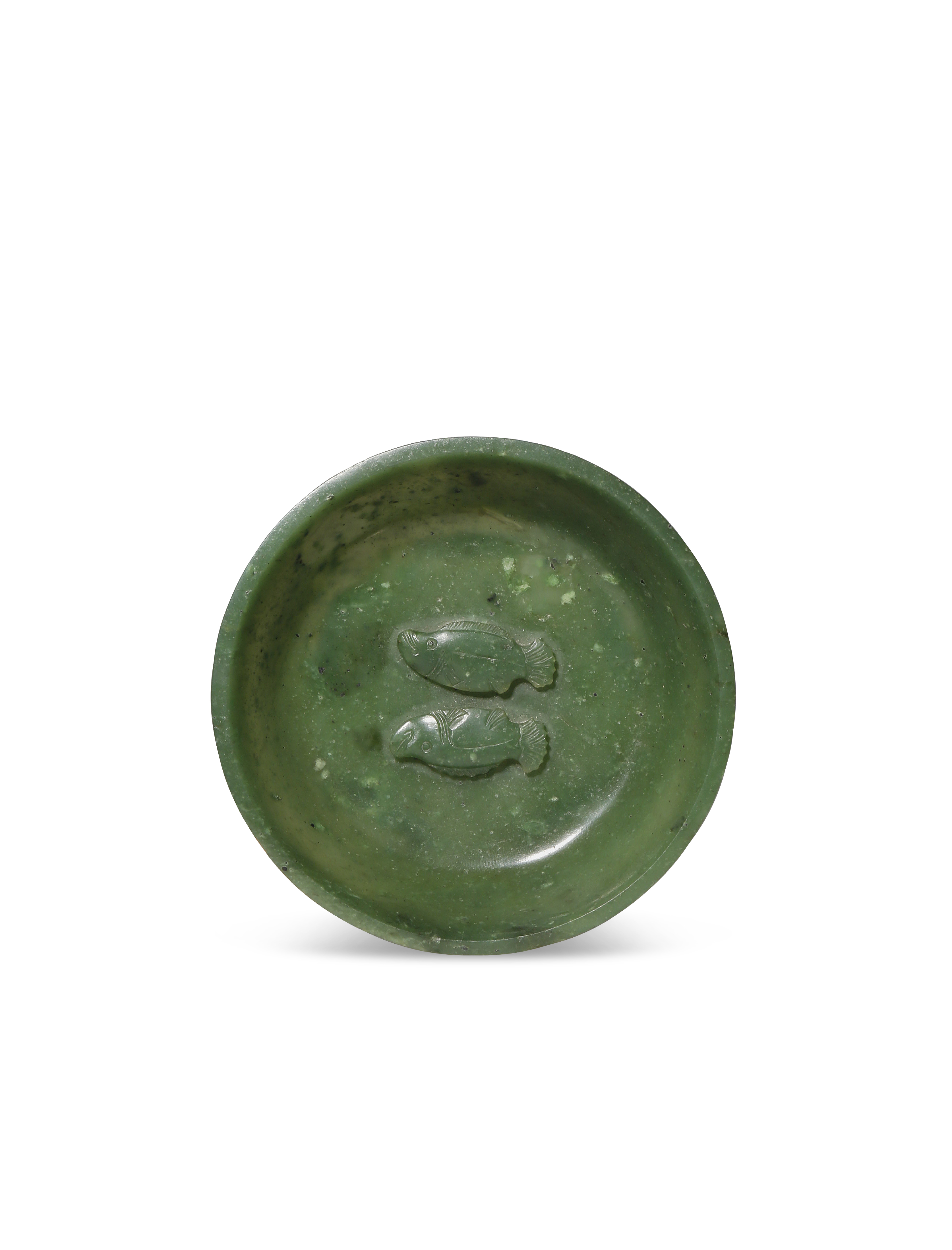 A SMALL CHINESE SPINACH-GREEN JADE 'MARRIAGE' DISH 18TH CENTURY The centre carved with twin fish