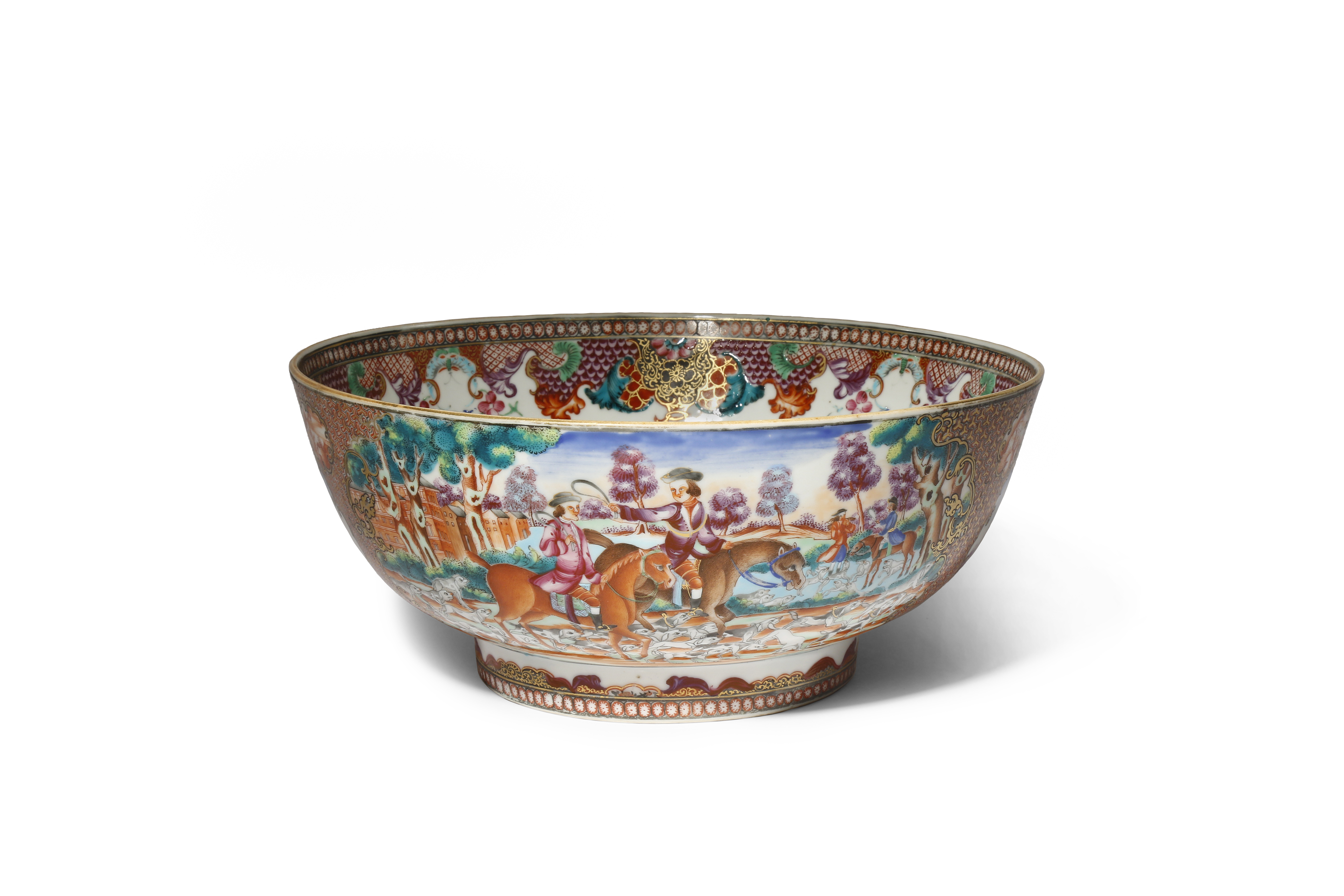 A CHINESE FAMILLE ROSE MANDARIN PALETTE 'HUNTING SCENE' BOWL QIANLONG 1736-95 Brightly painted to...