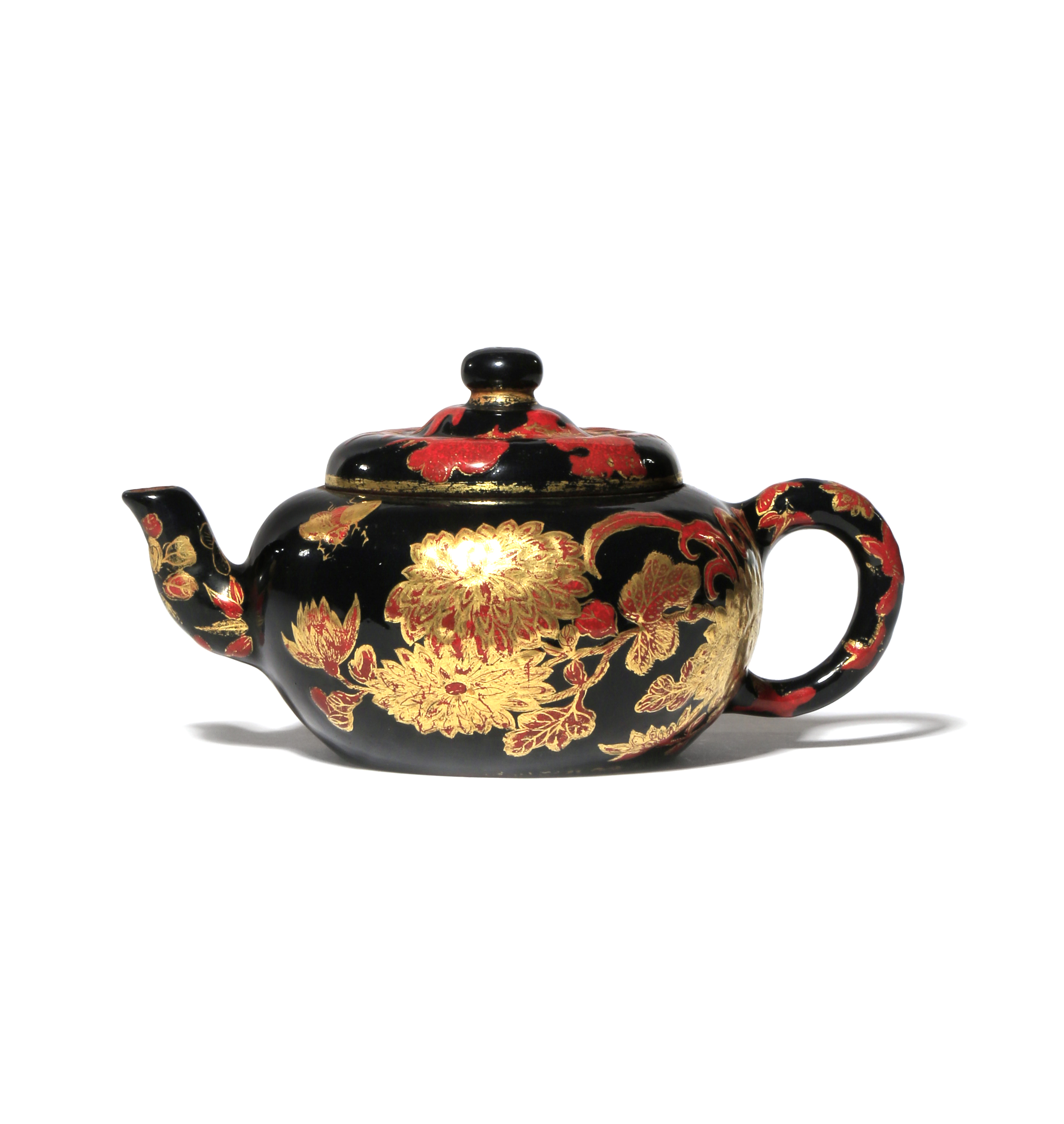 A CHINESE LACQUERED AND GILT-DECORATED YIXING TEAPOT AND COVER