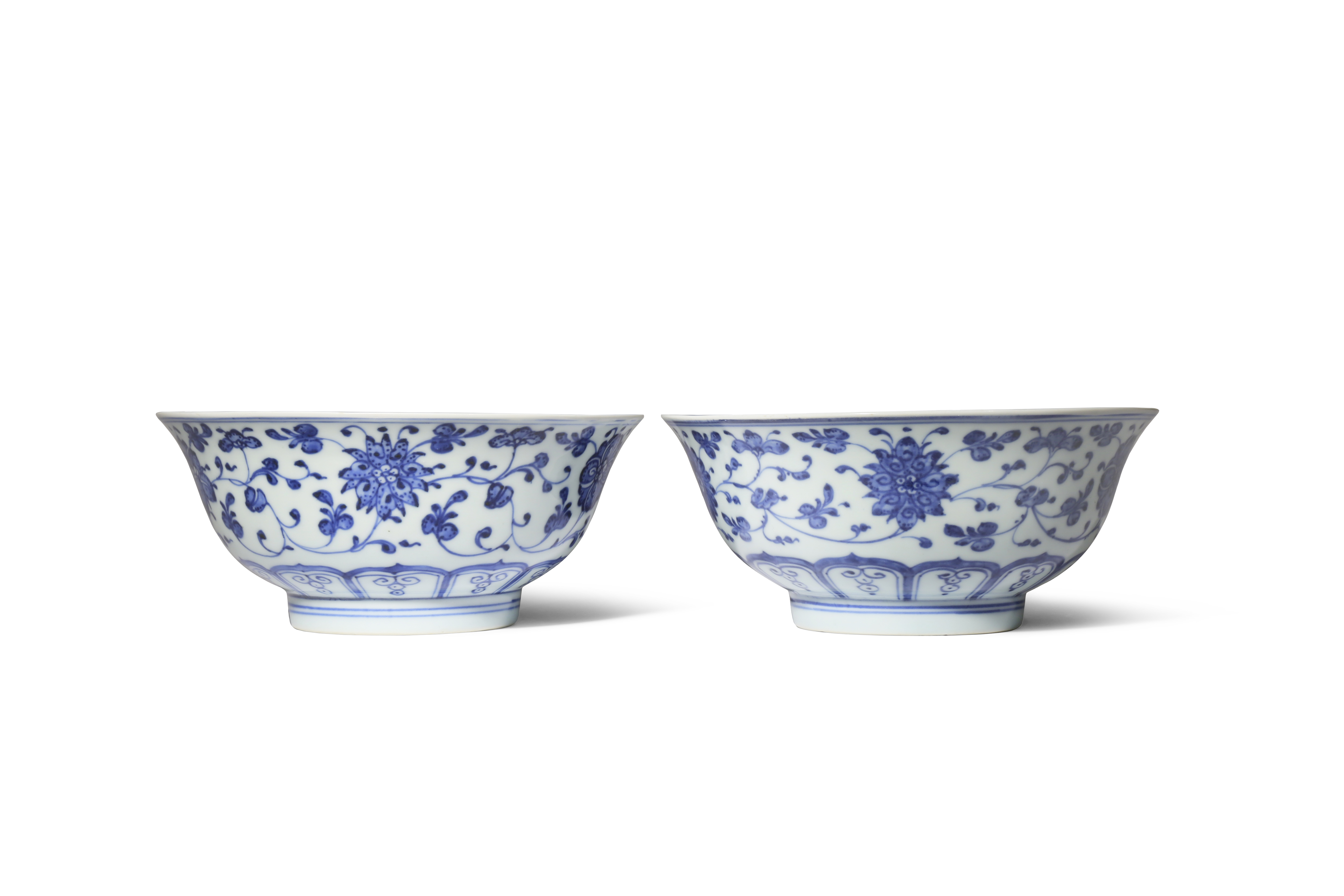 Each with a deep U-shaped body rising from a gently tapering foot to a flaring rim, decorated with various blooms including lotus and peony, the flowerheads set amidst scrolling leaves, with a further floral medallion contained within double blue lines to the centre of each, the footrims encircled by bands of petal lappets, 18.4cm. (2)