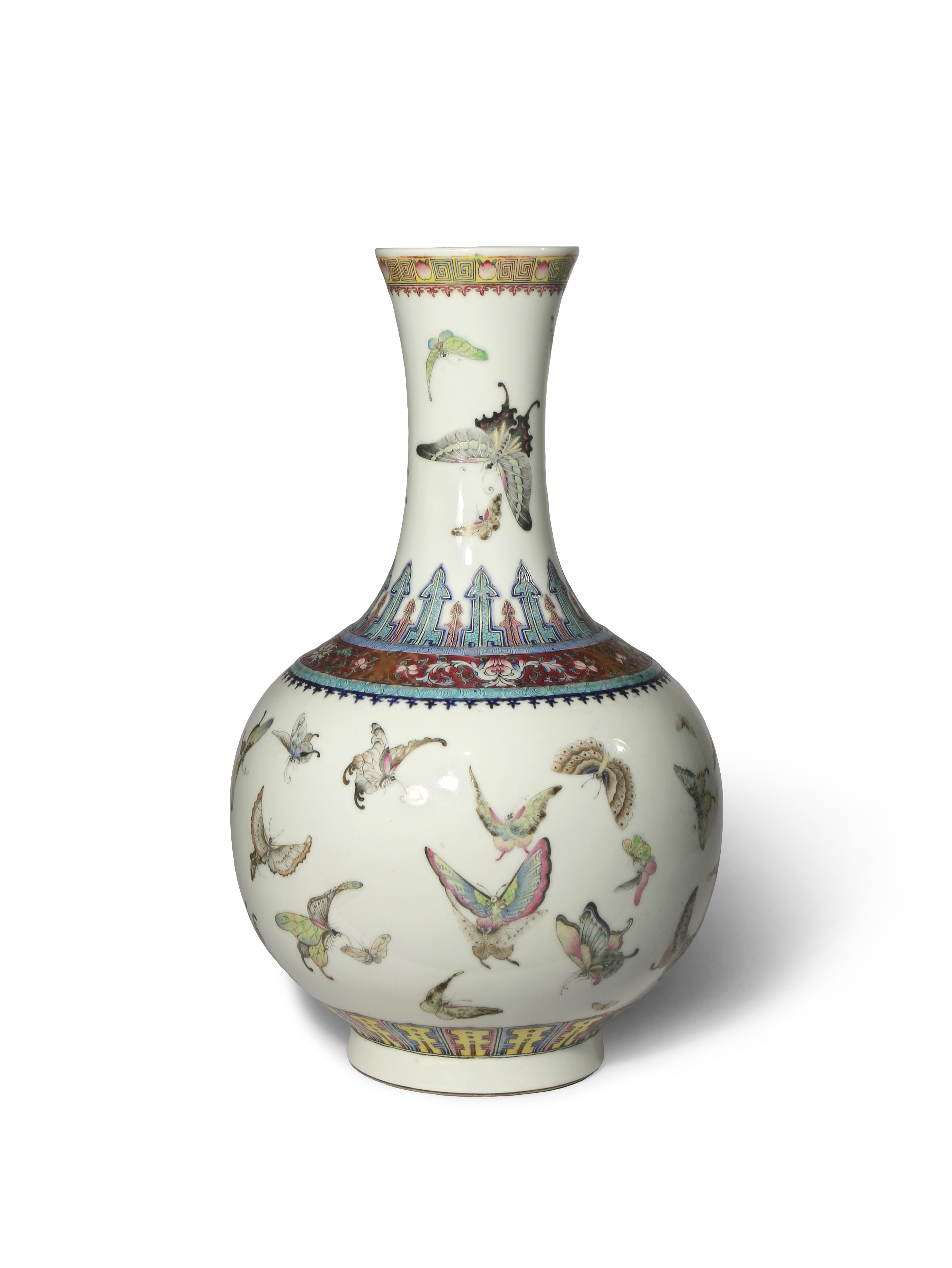 Finely painted in coloured enamels with many butterflies in flight above lappets, the design divided by a band enclosing gilt shou characters and scrolling flowerheads against a deep pink ground, with spearhead lappets rising from the shoulder up the tall flaring neck, the rim encircled by a key fret and peach design, 40cm.