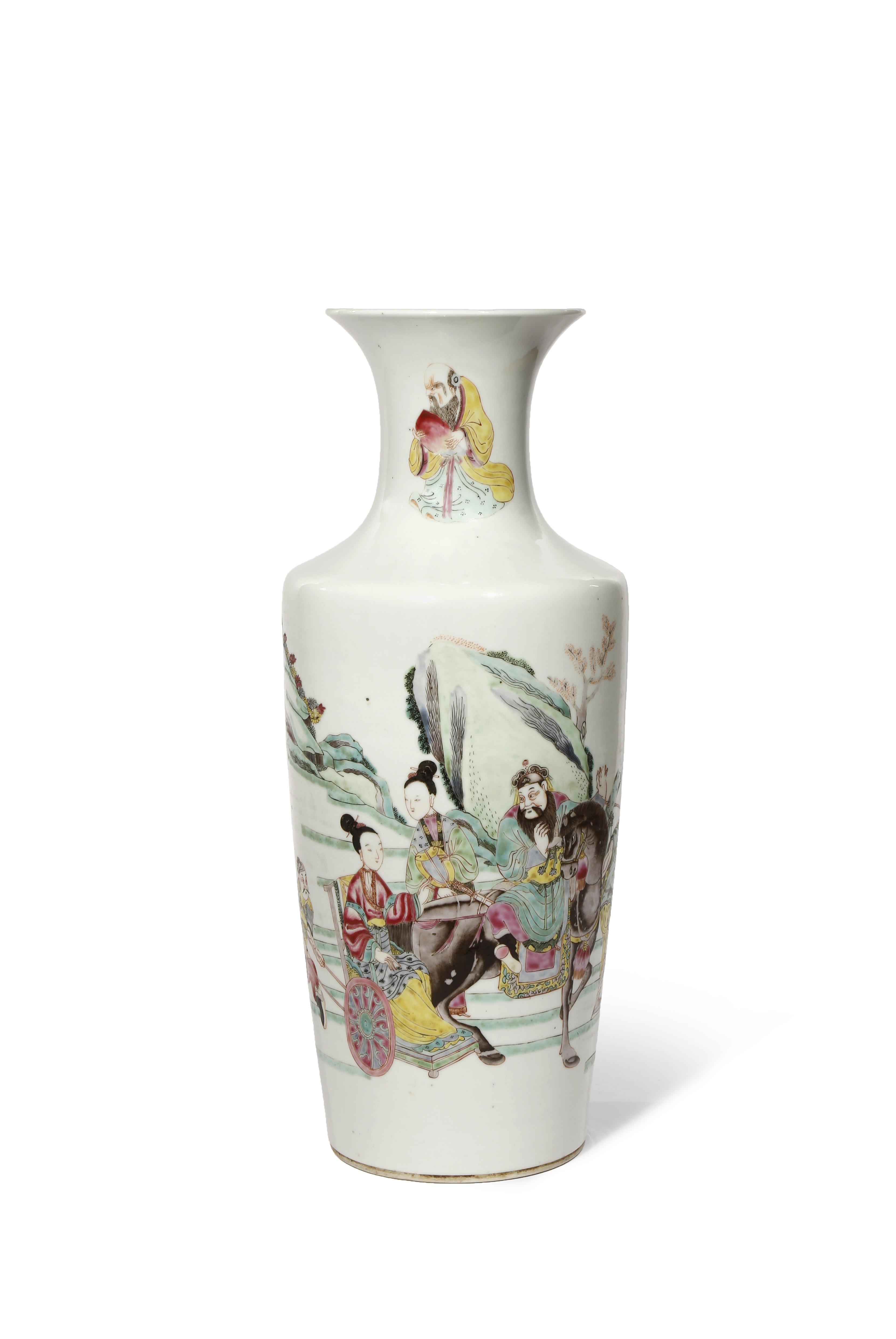 The exterior decorated in coloured enamels with Zhong Kui on horseback taking his sister through a rocky landscape to be married to his friend Du Ping, with attendants around them, the waisted neck painted with Shoulao holding a peach and two seal marks, 43.2cm.