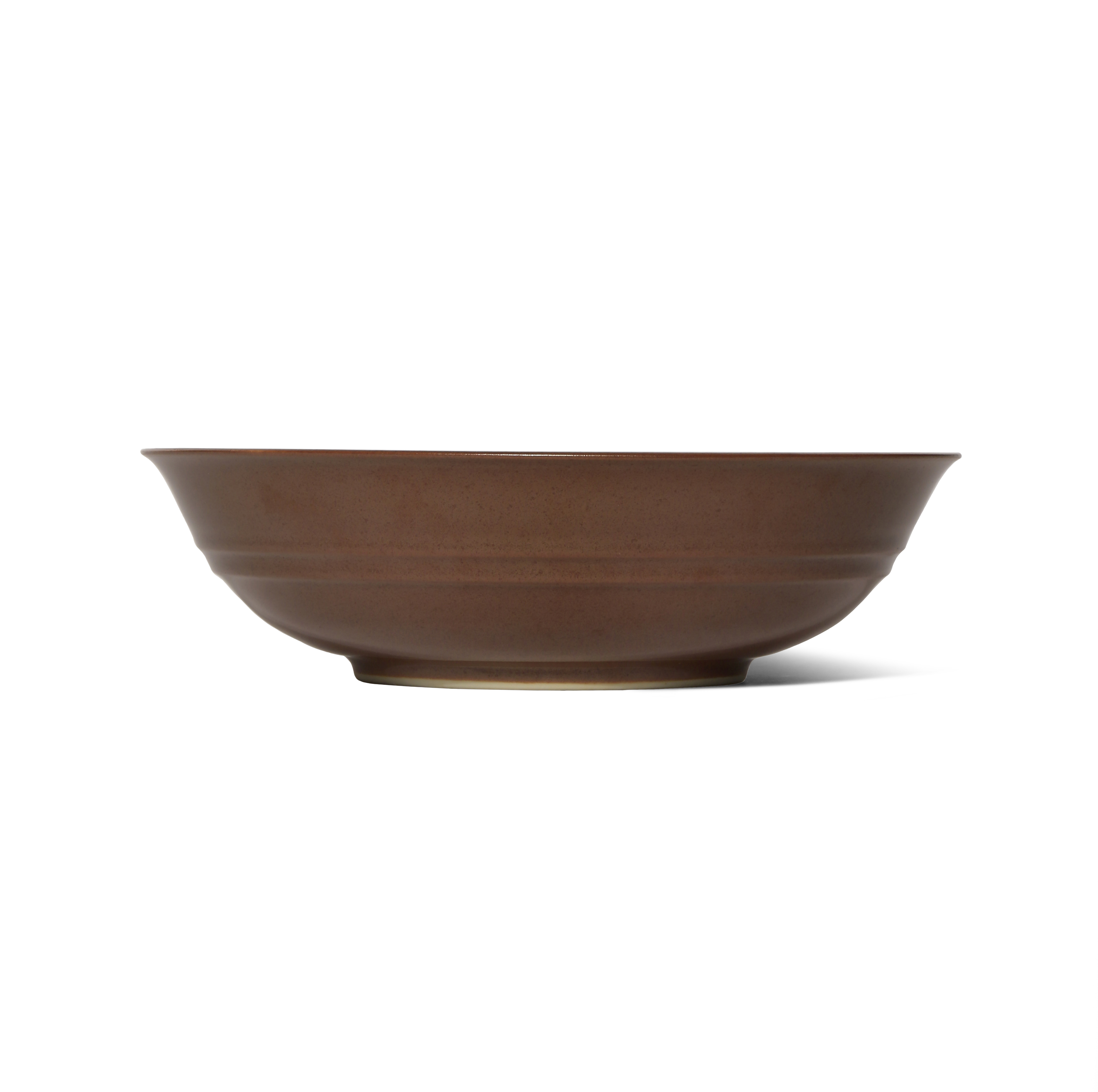 The deep body rising from a short tapering foot to a gently flaring rim, the exterior moulded with two raised ribs, the interior and exterior both covered with an even warm brown glaze, 17.1cm.