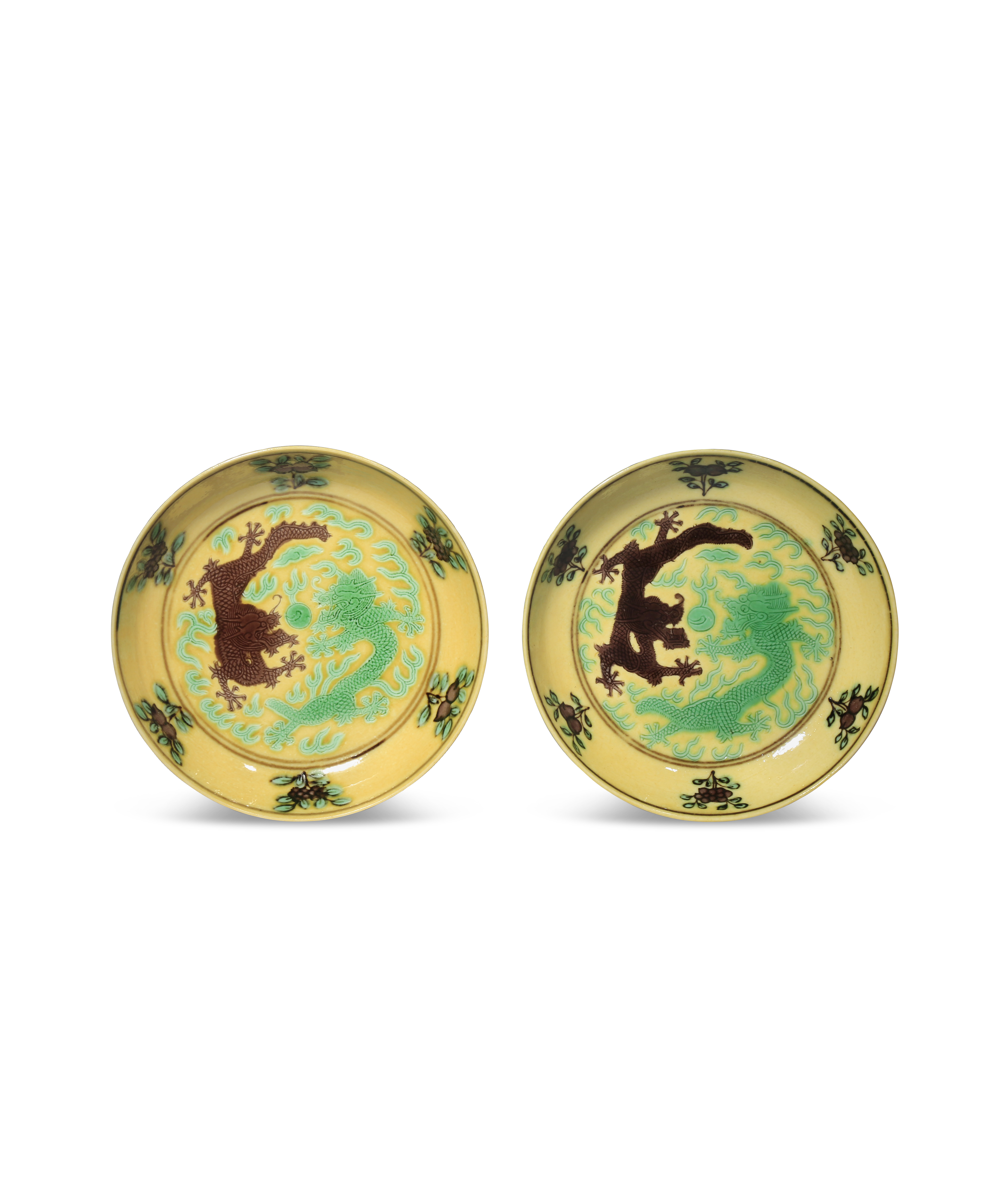 A PAIR OF CHINESE IMPERIAL YELLOW-GROUND 'DRAGON' SAUCER DISHES