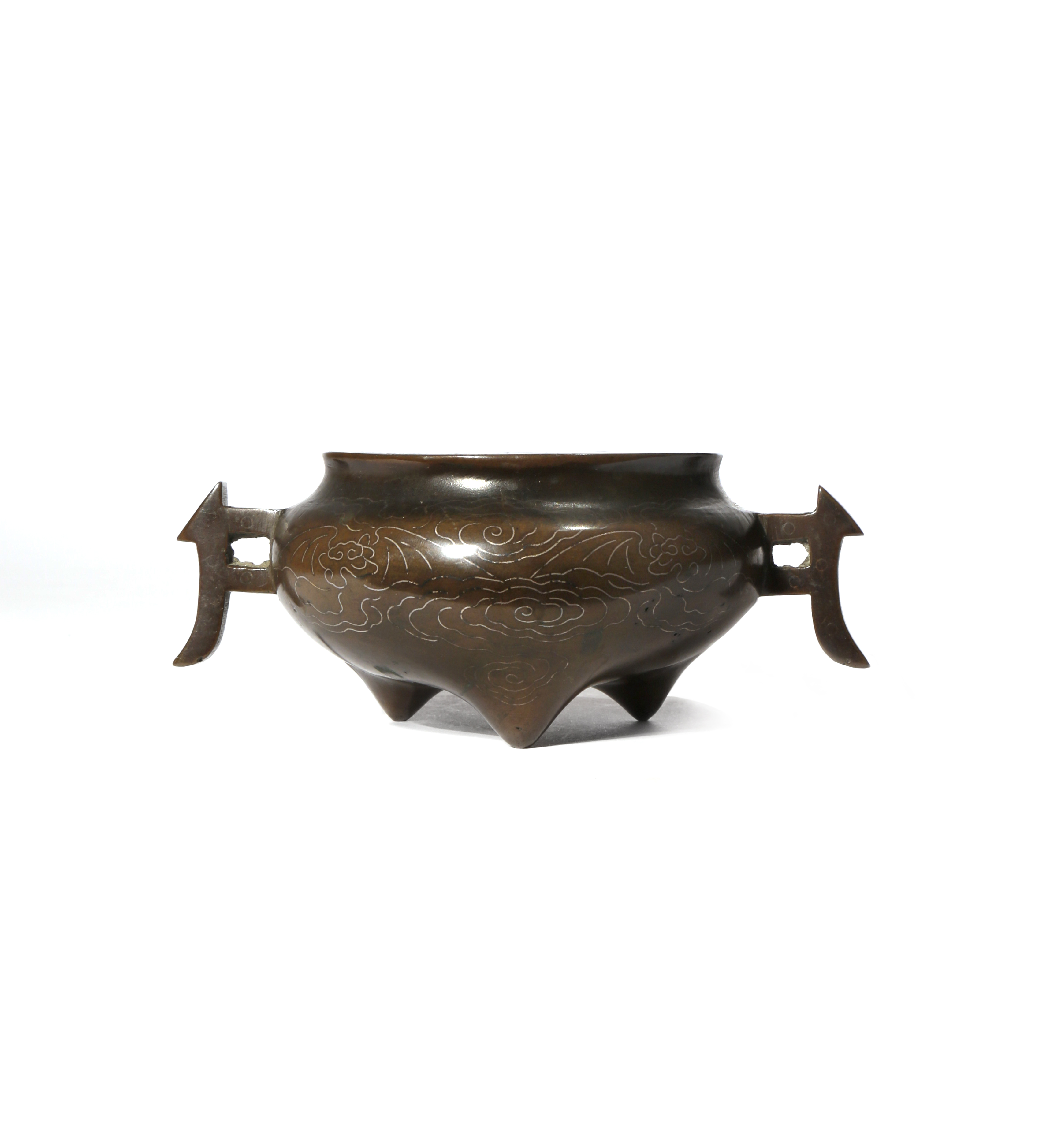 A SMALL CHINESE SILVER INLAID 'SHI SOU' BRONZE TRIPOD INCENSE BURNER QING DYNASTY The compressed...