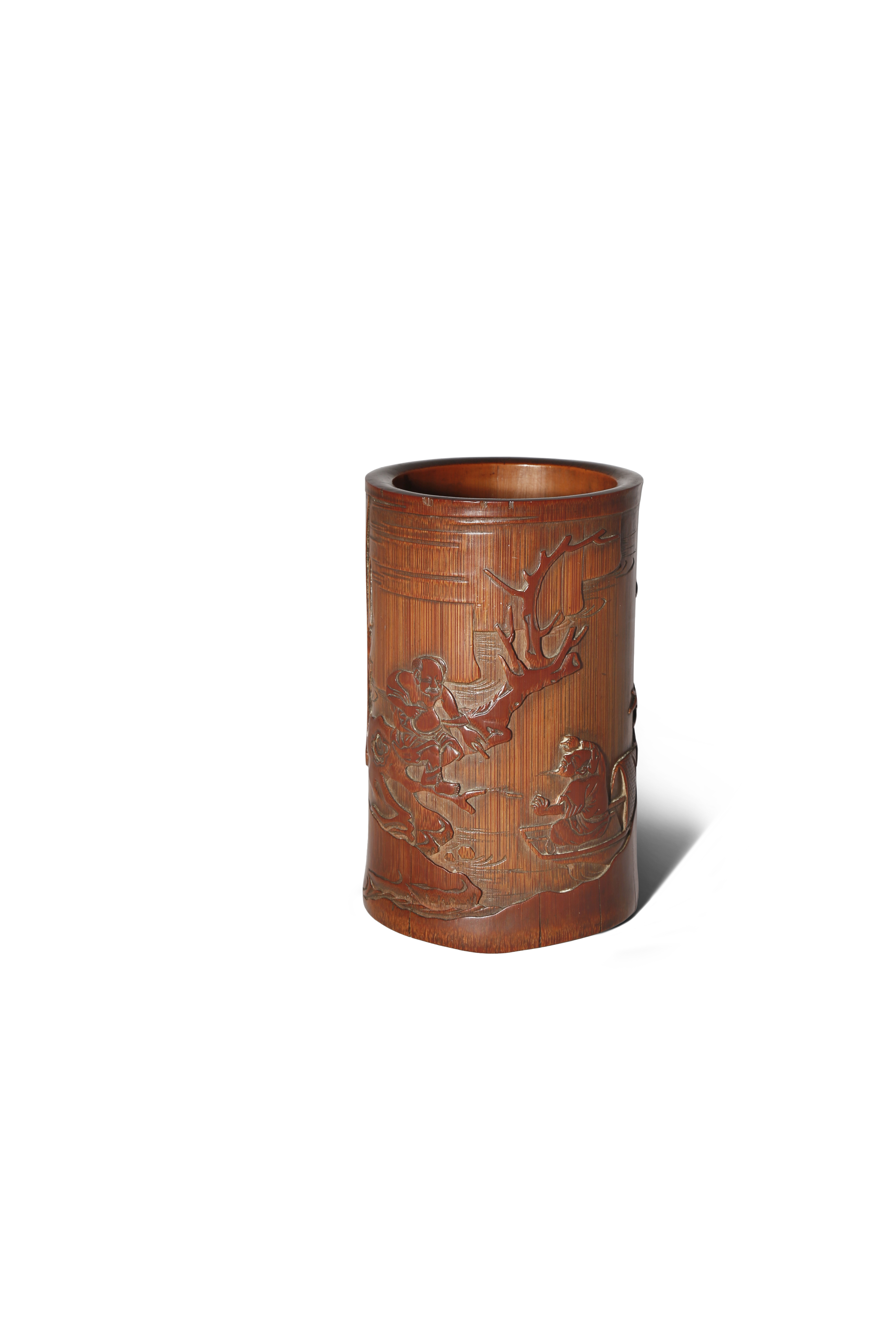 A CHINESE BAMBOO BITONG 18TH/19TH CENTURY The cylindrical body carved in shallow relief with a...