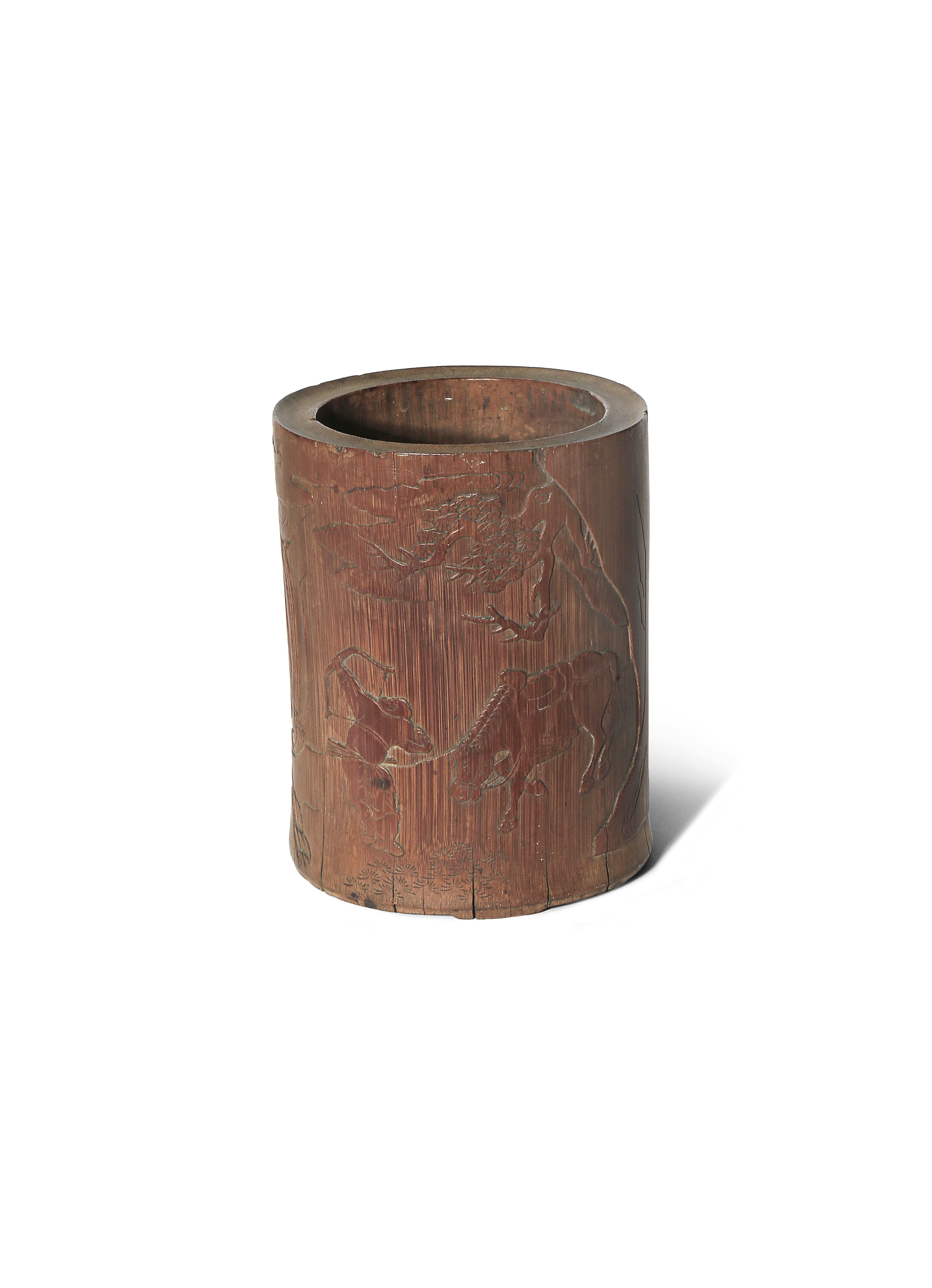 A CHINESE BAMBOO BITONG QING DYNASTY The cylindrical body carved in shallow relief with a...