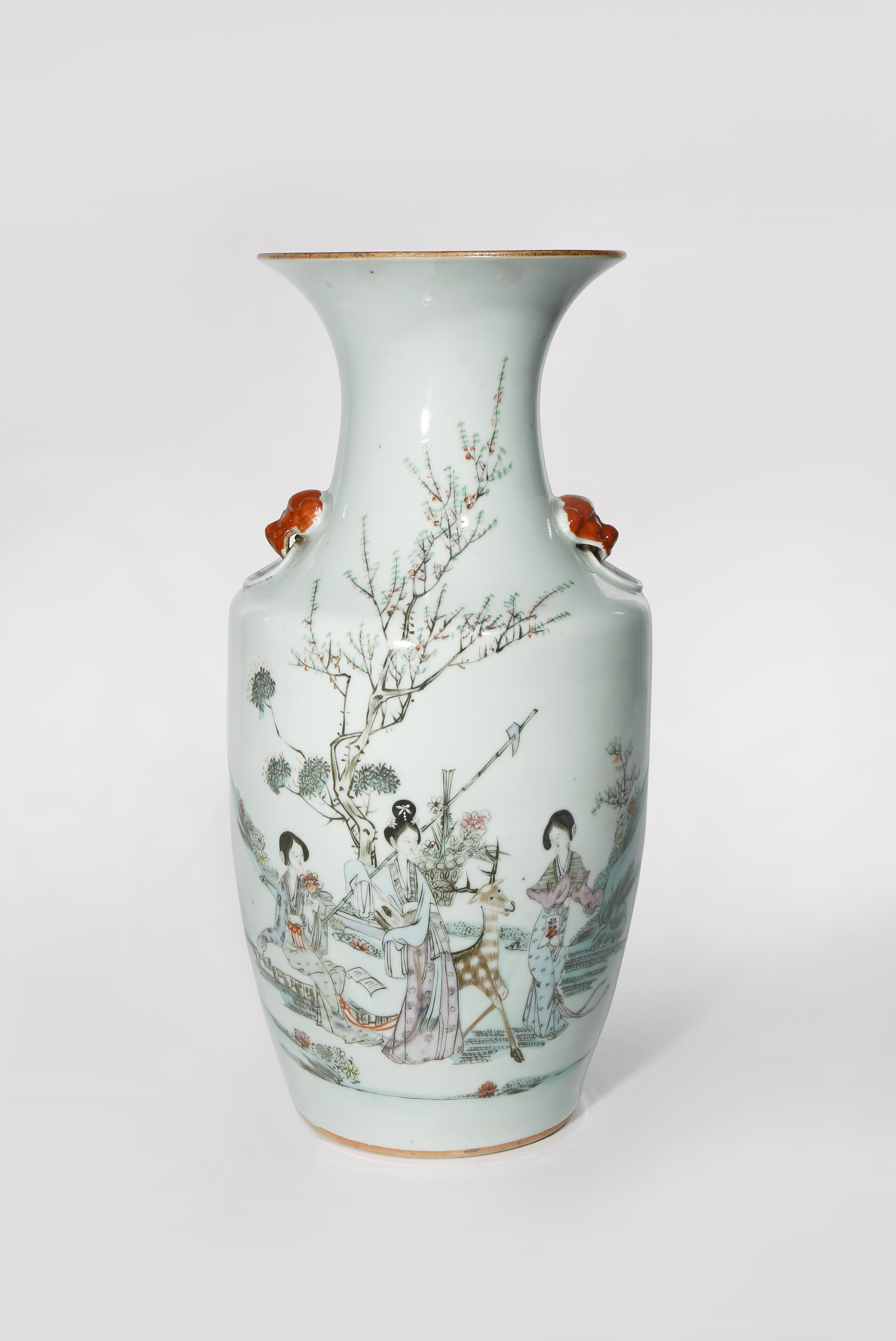 The ovoid body surmounted by a waisted neck and flared rim, painted with ladies carrying flowers beneath a budding tree, they gaze at a deer as it walks by, the reverse with calligraphy, with two animal mask handles to the shoulder, 42.5cm.