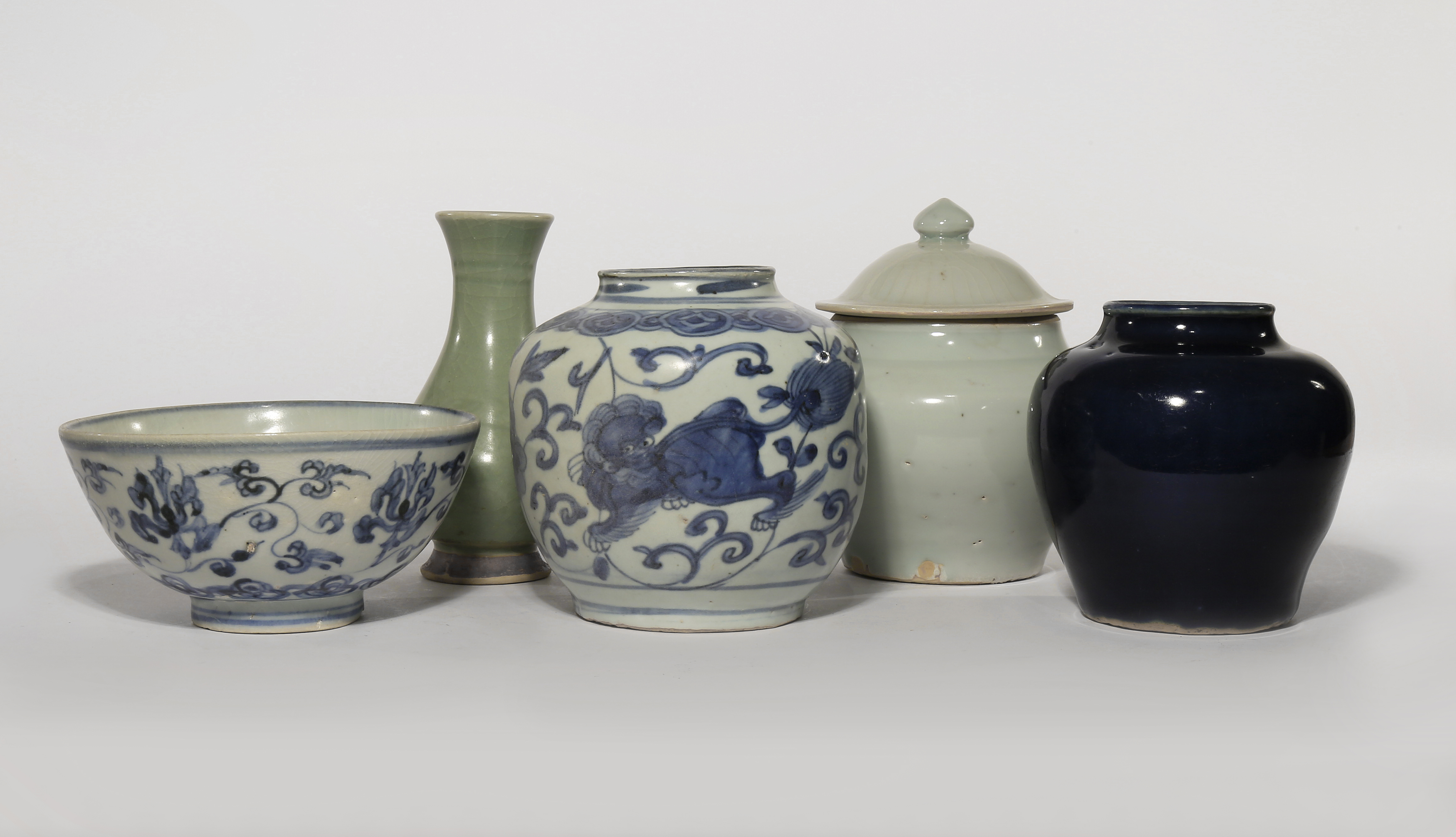Comprising: an ovoid blue glazed jar, a vase with a crackled celadon glaze, a jar and cover coated in a pale blue crackled glaze, a blue and white ovoid vase painted with lion dogs, and a blue and white bowl decorated with stylised lotus amidst scrolling foliage, 15cm max. (6)