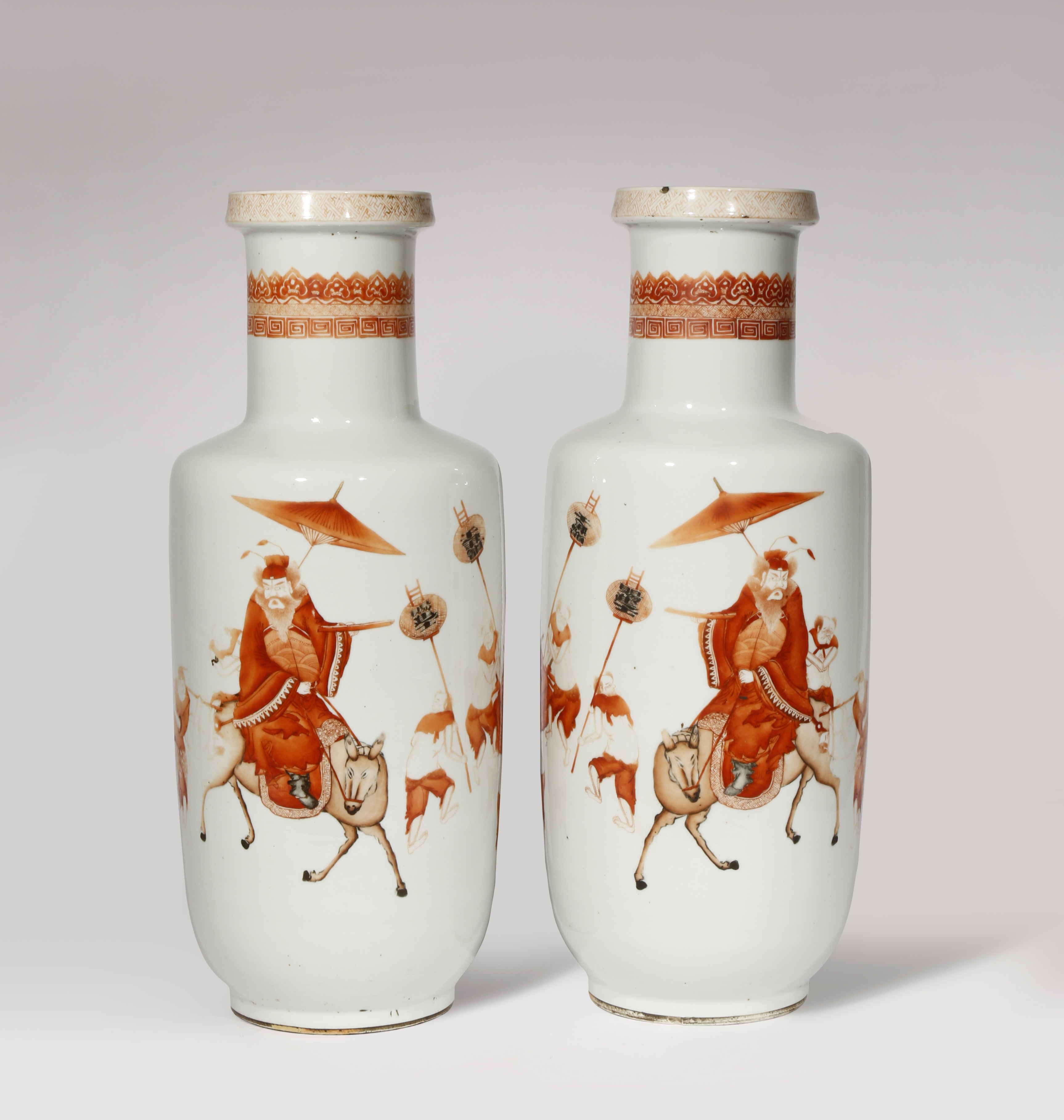 The tall body of each painted in iron-red with Zhong Kui riding on horseback in a procession, the vanquisher of ghosts surrounded by his quelled demons carrying gongs, lanterns, parasols and prisoners, with areas of detail picked out in black and gilt, the cylindrical necks decorated with bands of key fret, diaper and ruyi-heads, with geometric patterns encircling the mouthrim, 46.4cm. (2)