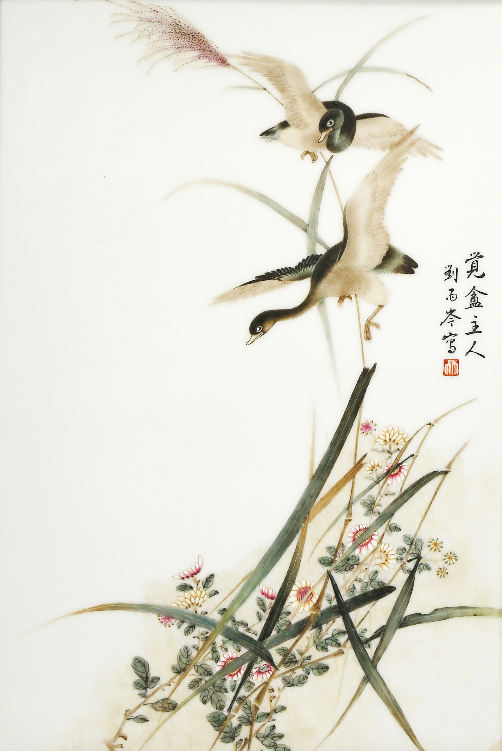 Decorated with a pair of ducks in flight above reeds and wild chrysanthemums, signed Liu Baicen to the top right, 40cm x 27cm.