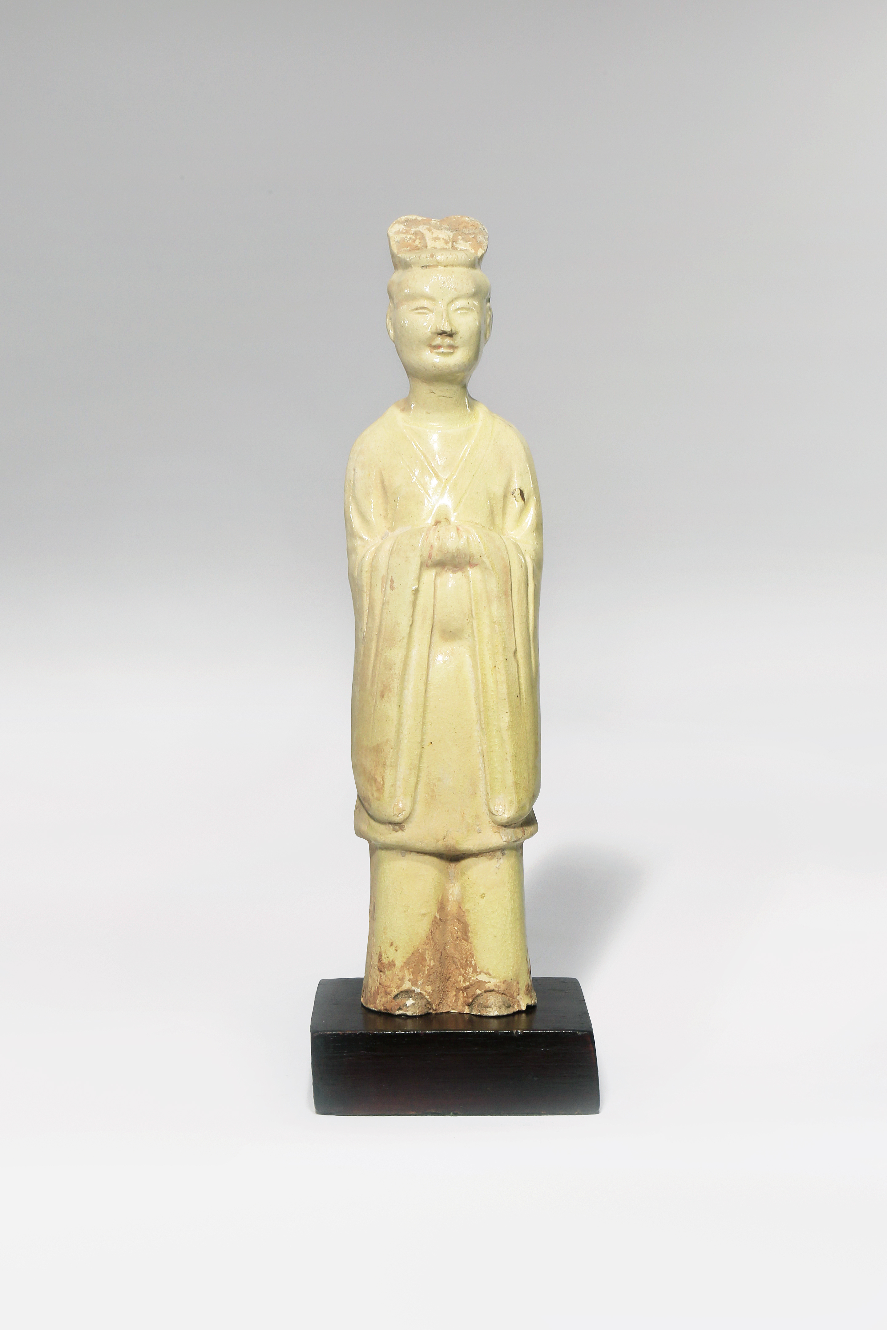 A CHINESE POTTERY STANDING FIGURE OF AN ATTENDANT TANG DYNASTY Depicted standing with his hands...